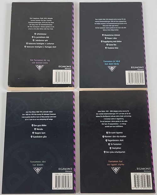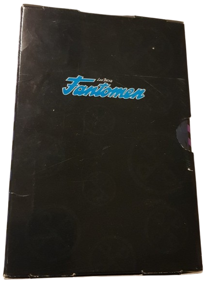 The Fantomen De Bästa Äventyren box set comic books were sold in a custom produced cardboard sleeve, containing motifs and logos as seen throughout Fantomen comic books published in Sweden. All 4 artist names featured in the series are printed on the side of the box set sleeve. The box set can be seen below.