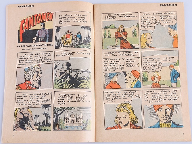 Below we see a few internal pages featuring the Phantom found within the comic book, in his blue suite and red trunks, the colors the Phantom is published in Sweden. The comic strip is published in Swedish language.