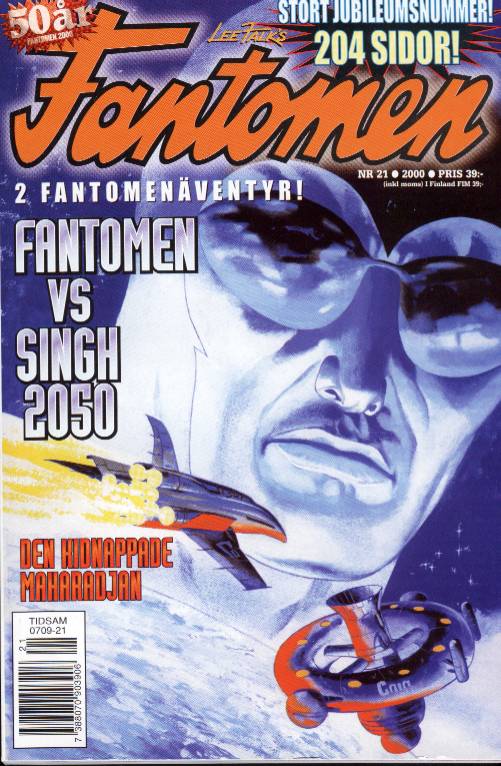 Fantomen celebrated its 50th anniversary in October 2000, releasing a 204 page (in color and black and white) special (the largest Fantomen issue ever published), issue number 21 (as seen on the left). This comic book contains, amongst other stories, Fantomen’s first published story in 1950, ‘The Maharajah’s Daughter’. This issue also contained a story with the Phantom based well into the future, set in the year 2050.