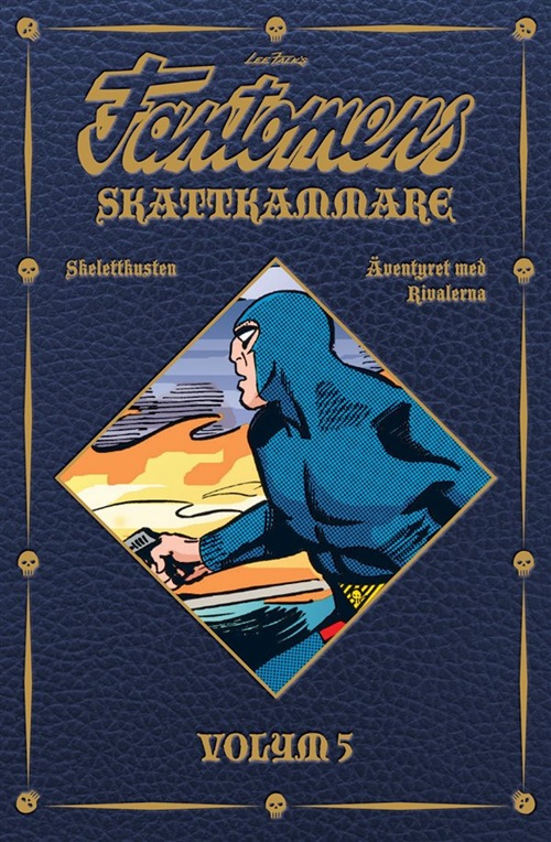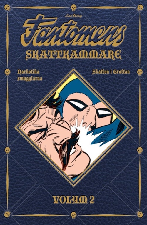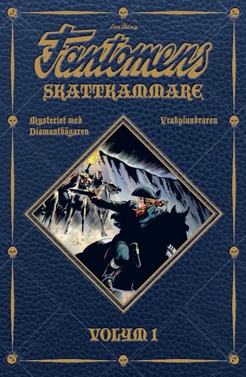 Fantomens Skattkammare comprises pages of varying lengths, ranging from 39 to 63, contingent upon the featured Phantom stories, presented in a combination of color and black-and-white pages. The series contain a unique cover design, a blue leather pattern with gold print, with the story titles featured noted. An image of the Phantom is also seen, taken from a comic strip contained in the edition. The first five covers of the digital comics can be seen below.