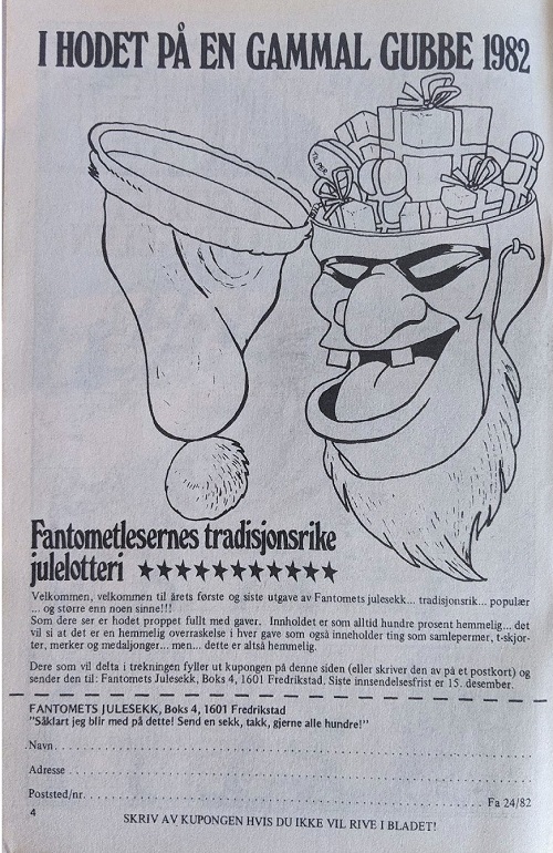 The Fantomet ‘Christmas Sack Contests’ were published in Fantomet comic book number 24 in Norway in 1982. 2 contests are found in this edition, 1 each on the inside front and back covers of the comic book.
