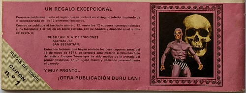 To enter the contest, the reader was required to collect 12 unique coupons located on the corner of the back covers of the first 12 Héroes del Cómic editions, and mail them into Buru Lan S.A De Ediciones at their San Sebastián address. Each coupon number changed, with the coupon number reflecting the Héroes del Cómic edition number.