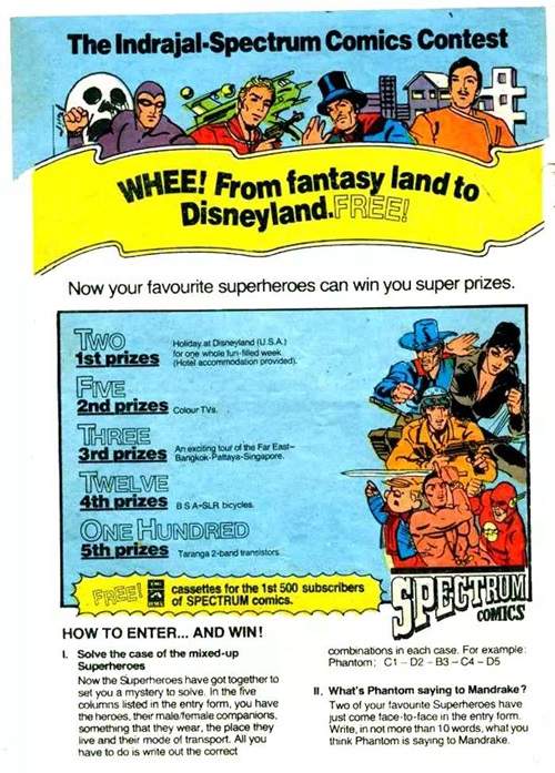 The Indrajal-Spectrum Comics Contest was initially promoted in Indrajal Comics volume 22, number 49 published on the 8th of December 1985. The full page advertisement features a variety of comic book characters, including the Phantom. It also details the 122 prizes on offer and how to enter the contest.