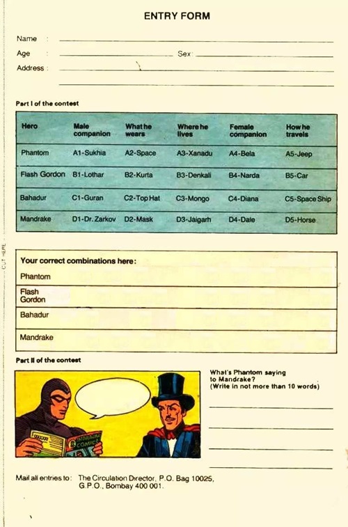 Entry forms were published in 3 Indrajal Comics comic books released on the 15th, 22nd and 29th of December 1985, and also in 2 Spectrum Comics comic books released on the 6th and 31st of December 1985. The front covers of the 3 Indrajal Comics to feature the contest can be seen below.