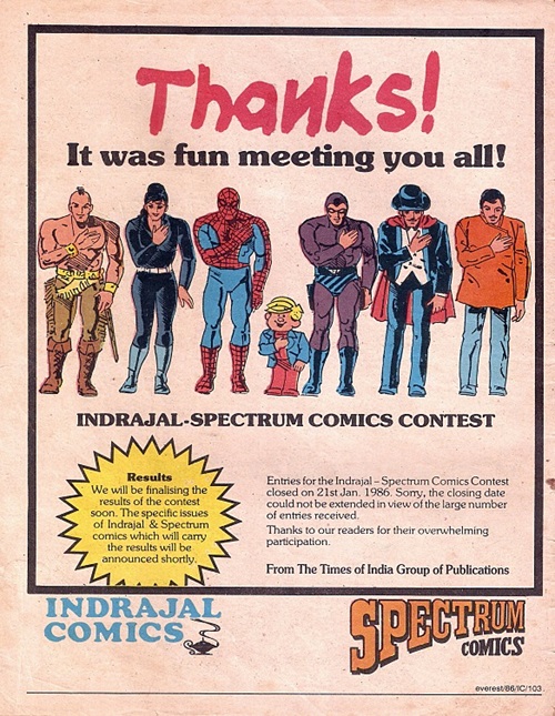 A full page thank you message is published by The Times of India in Indrajal Comics volume 23, number 12 published on the 23rd of March 1986. The publisher notes that an ‘overwhelming participation’ to the contest was received. The Phantom is seen amongst a range of comic book characters, all illustrated in a thank you pose.