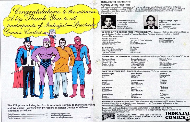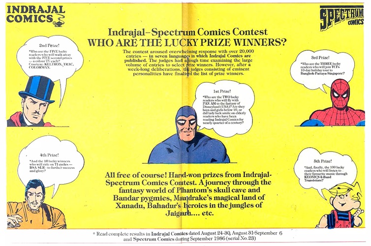 Before the winners were announced by The Times of India, a 2 page full color feature is published in the center of Indrajal Comics volume 23, number 33 published on the 17th of August 1986. The publisher notes that over 20,000 entries were received in a variety of languages. A recap of the prized on offer are found in the speech bubble of a variety of comic book characters, with the 1st prize spoken by the Phantom.