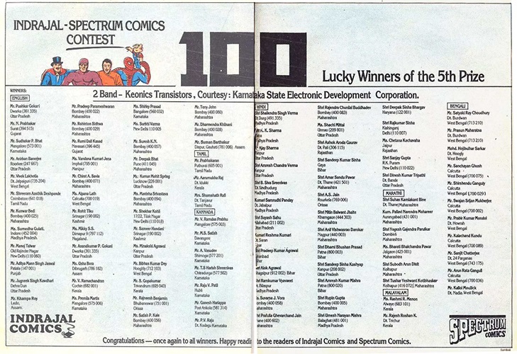 The 100 winners of the 5th prize of a 2-band transistor radios are published in Indrajal Comics volume 23, number 36 published on the 7th of September 1986 (front cover seen above right). The 2 page feature lists the 100 names of the prize winners and also their address, grouped in the spoken language of each entrant. An illustration of the Phantom amongst other comic book characters is also seen.