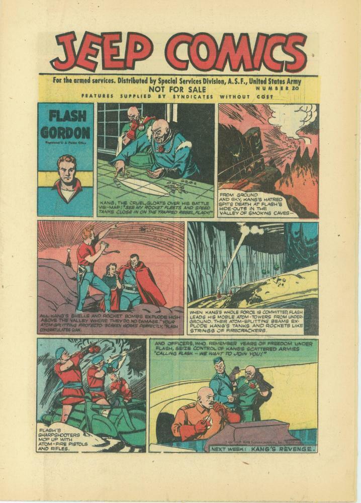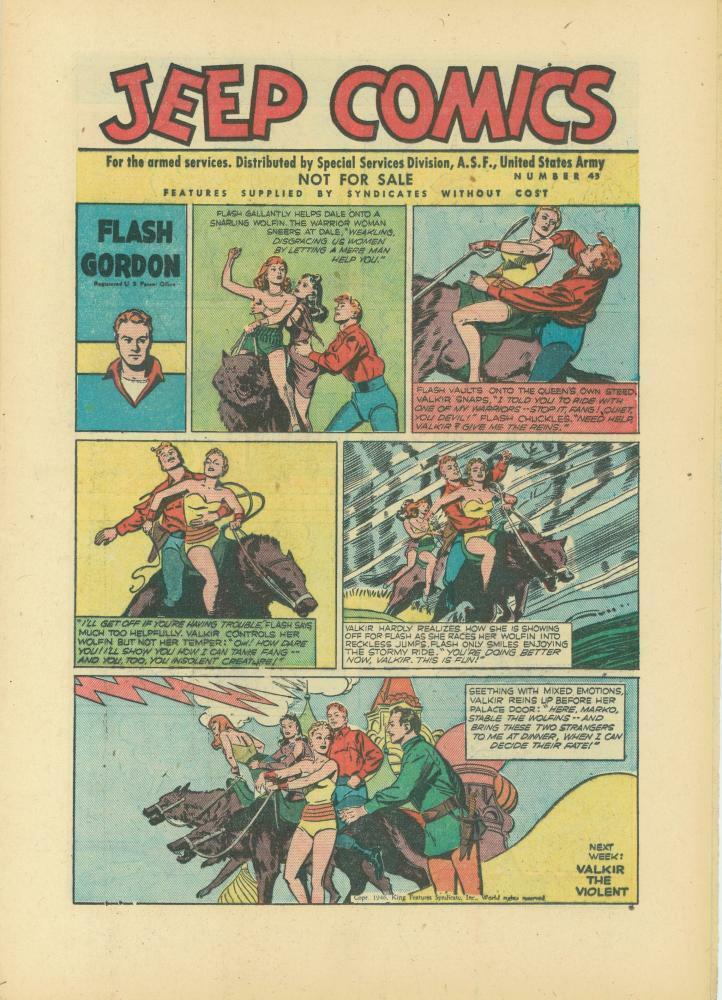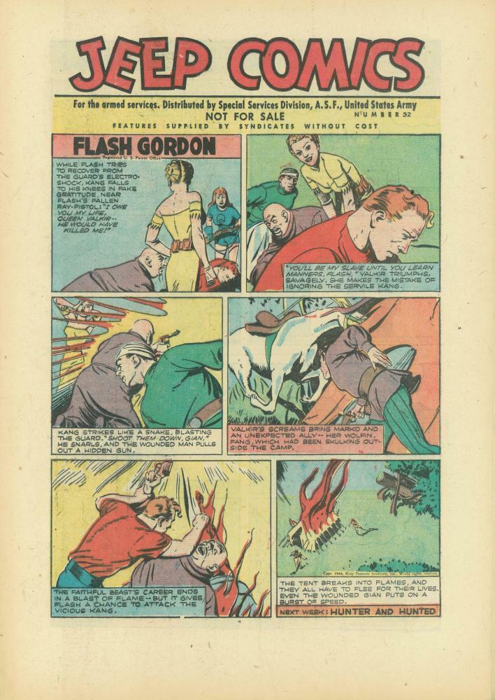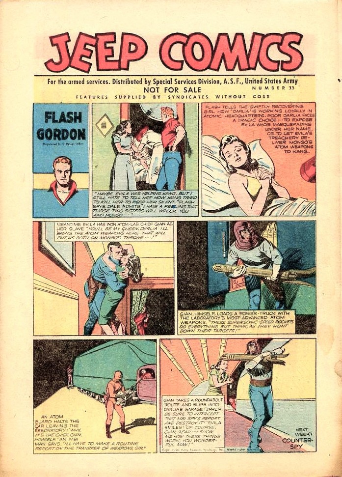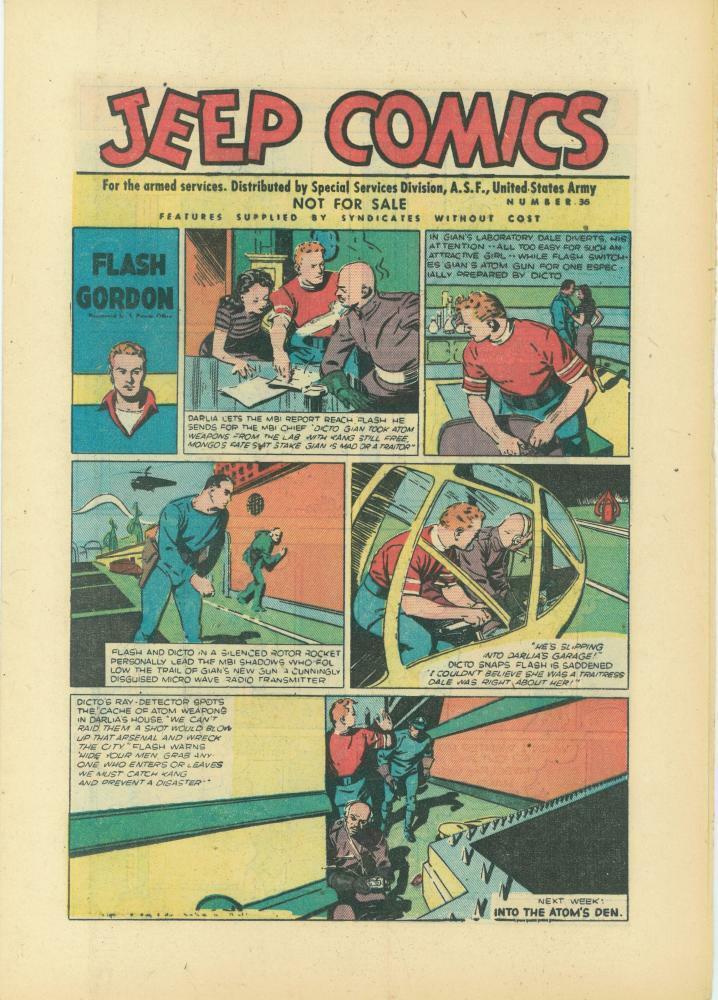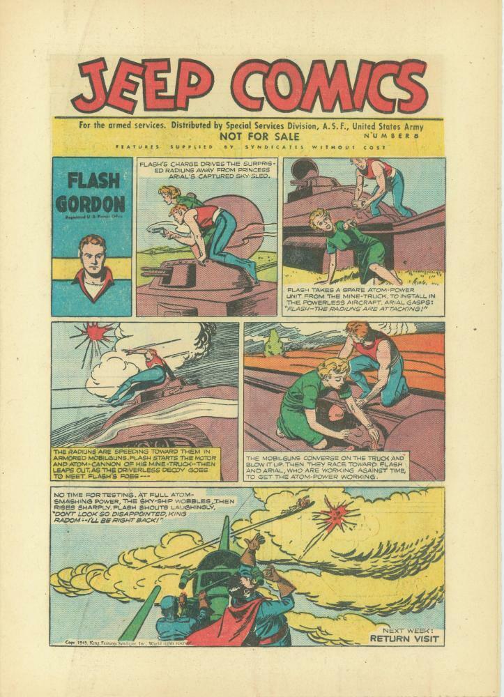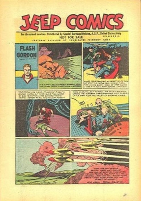 On the cover of each issue can be found a Flash Gordon comic strip with the title ‘Jeep Comics’ as the header and the issue number to the right. Also clearly visible is ‘Not For Sale’ wording.
