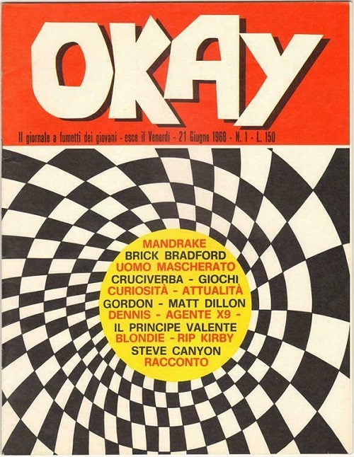 OKAY is a comic book series published by Editoriale Corno in Milan, Italy in 1968. The 4 edition series was published weekly between the 21st of June 1968 and the 12th of July 1968. We also see the phrase ‘il giornale a fumetti dei giovani’ on each cover, translating from Italian to ‘the comic strip for young people’.