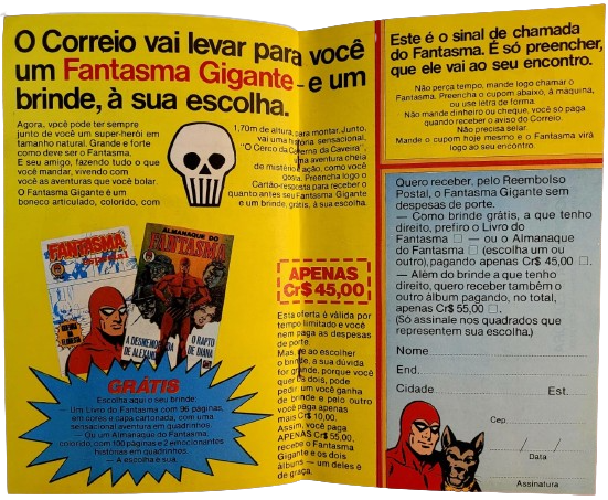 As a free gift, to which I am entitled, I prefer the Book of the Phantom or the Almanac of the Phantom (choose one or other), paying only Cr$ 45.00. In addition to the gift to which I am entitled, I also want to receive the other album by paying a total of only Cr$ 55.00. (Only tick the boxes that represent your choice.)