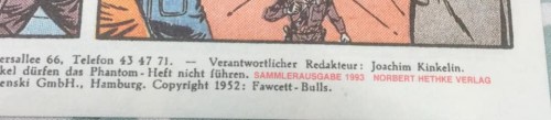 Another indictor between these two series (original and reprint) is found on the lower back cover. Where we find the publishers address and copy right information, on the reprint series, we see in red text the wording ‘Sammlerausgabe 1993 Norbert Hethke Verlag’, which translates from German to ‘1993 Collector’s Edition by Norbert Hethke Verlag’. An example is shown below, with the original at the top and the reprint at the bottom.