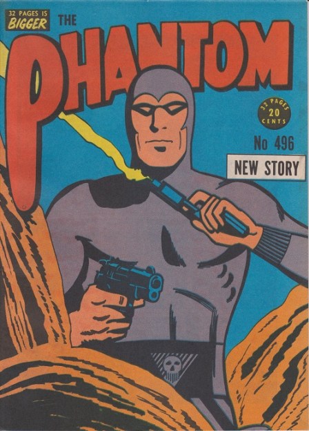 Not so in the first Frew printing and the following two reprints! The cover of edition number 496 included a box announcing the issue contained a new story, but no story title appeared on the cover, which featured a posed illustration of the Phantom wielding his trademark handguns.