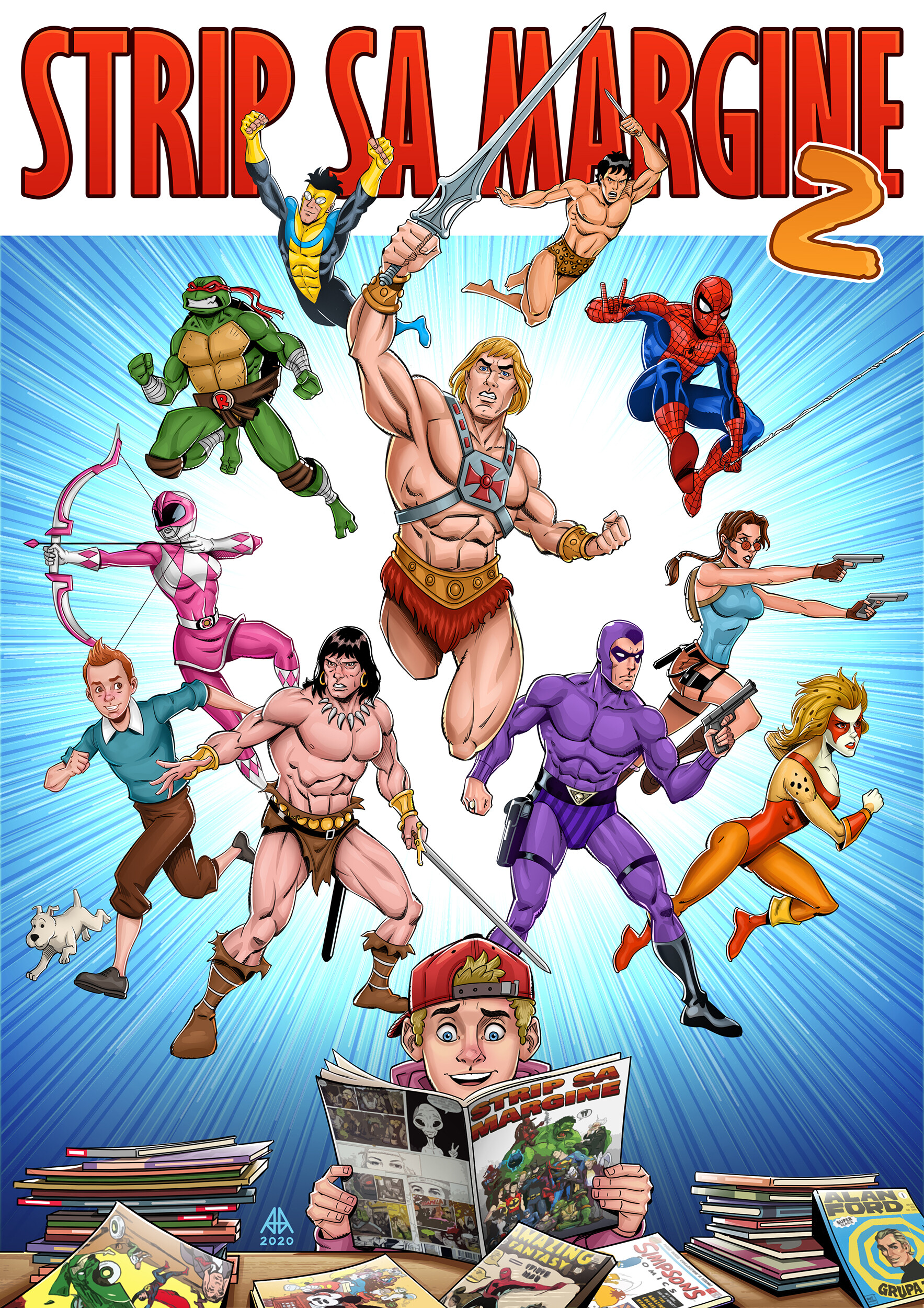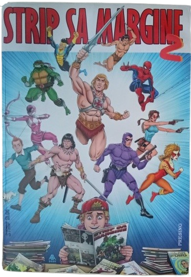 The cover of Strip Sa Margine edition number 2, illustrated by Aleksandar Anđelković in 2020, features a vibrant tribute to global pop culture icons emerging from the imagination of a young reader, which can be seen below. At the center stands He-Man with his sword raised, surrounded by a diverse cast including The Phantom, Spider-Man, Conan the Barbarian, and Invincible. Other notable figures bursting from the pages include Lara Croft, Cheetara from the ThunderCats, the Pink Power Ranger, Raphael from the Teenage Mutant Ninja Turtles, and the classic duo Tintin and Snowy.