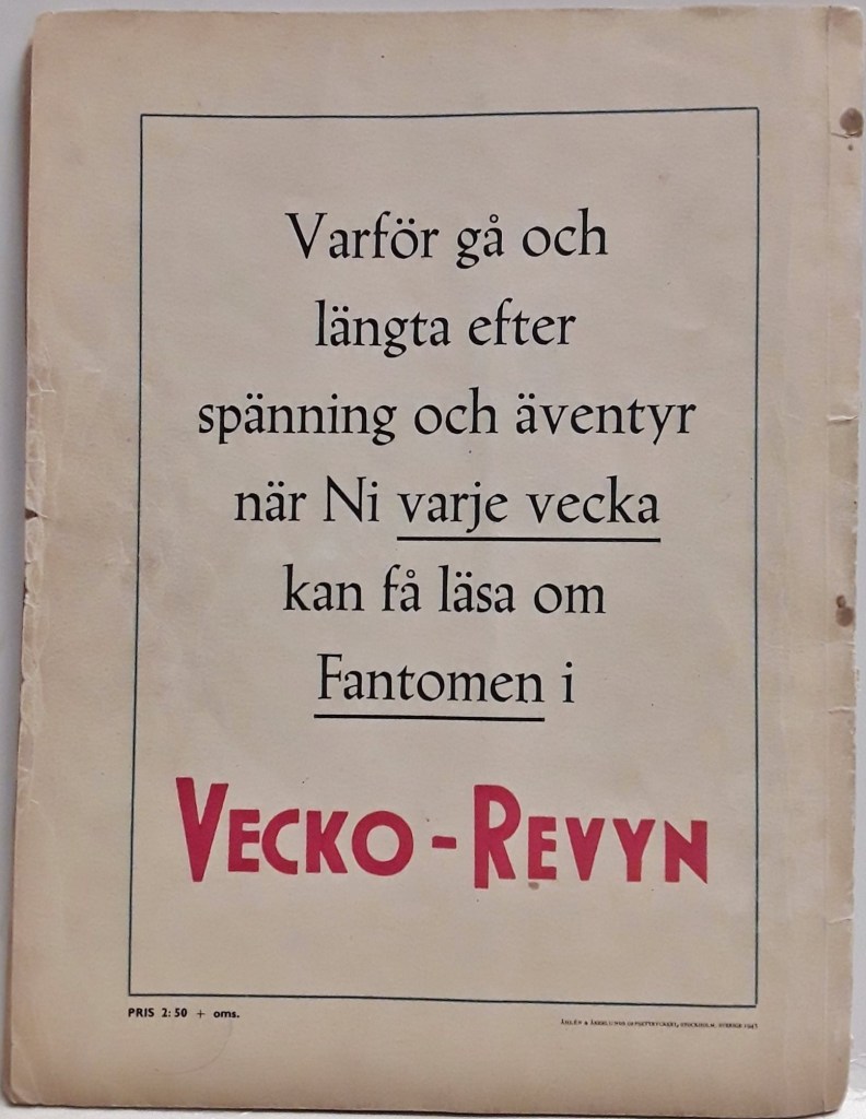 Vecko-Revyn (translates to ‘Weekly Review’ in English) was a Swedish lifestyle and women’s magazine published in Stockholm, Sweden by the Bonnier Media Group. It existed between 1935 and 2018. This publication is similar to Australia’s ‘The Australian Woman’s Mirror‘ which was also the first to print a Phantom comic strip in that country.