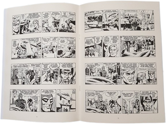 The Phantom comic books are issued with from 24 thru to 28 pages presented in black and white, with color exclusively reserved for the external front and back softcovers. The comic strip stories contained within are printed in Indonesian, having been translated from their original English editions. Each publication contains multiple Phantom stories, prominently featuring the comic strip stories written by Lee Falk and illustrated by Sy Barry.