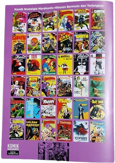 The front covers don’t display an edition number; however, the publisher’s name, ‘Komik Marabunta’ is prominently featured on all editions at the top left, set against a black background. The back covers serve as a form of a catalogue, listing the other comic book editions in the series, which includes comic book characters such as Flash Gordon, Mandrake the Magician, Garth, Rip Kirby, Zorro, Conan, Tarzan, Batman, Modesty Blaise, Prince Valiant, Dick Tracy and more.