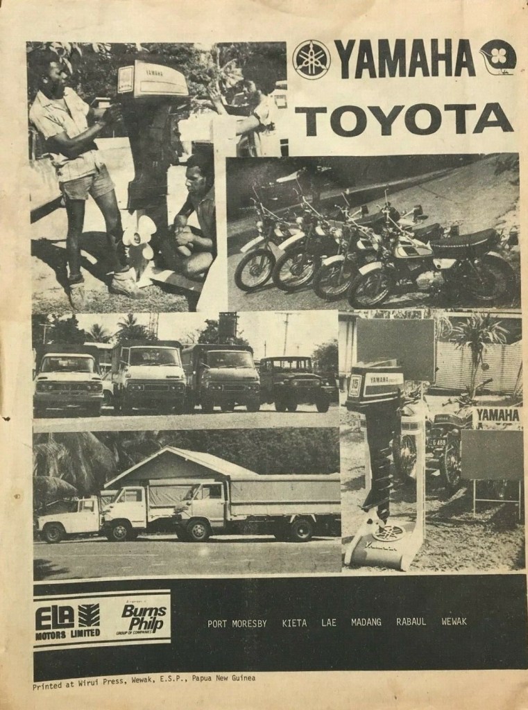 Issue number one contains the ‘Wantok’ logo used on the cover Wantok Niuspepa, yet not present on the second edition. It also contains a Yamaha/Toyota advertisement on the back cover (as seen below).