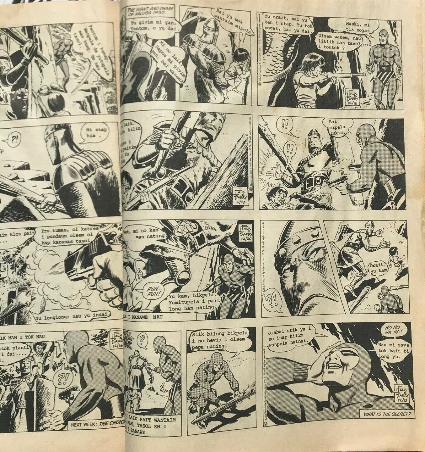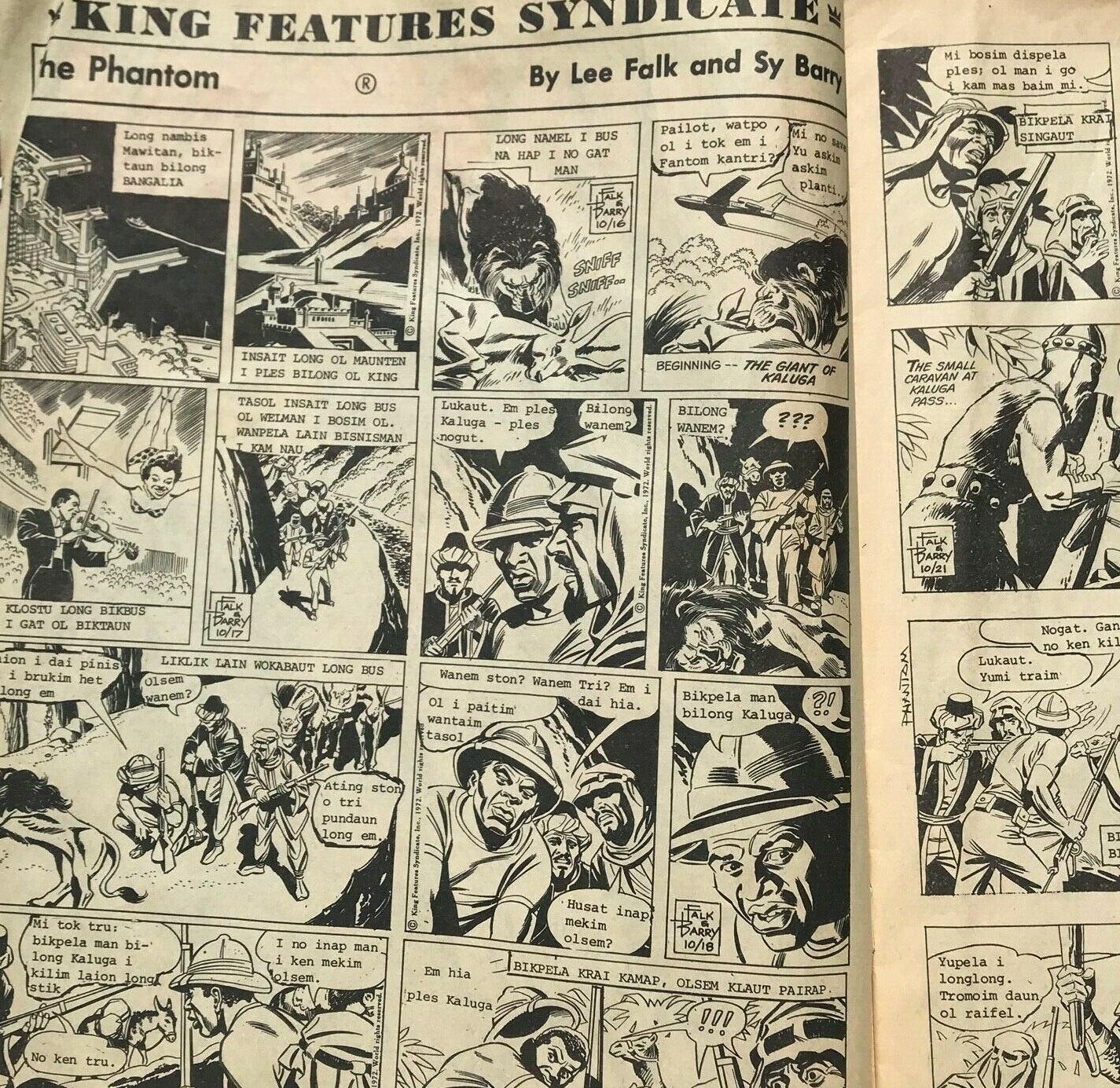 2 Phantom comics were printed in the 1970’s, in Tok Pisin language. The comics are larger then traditional comic books, measuring 22cm x 30cm and were printed in black and white (except for the color cover). They contain approximately 24 pages and were printed by Wirui Press.