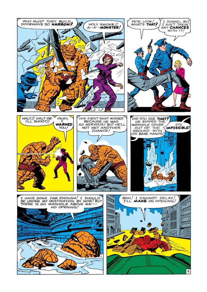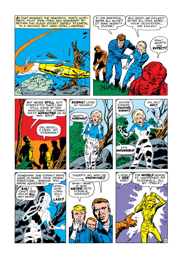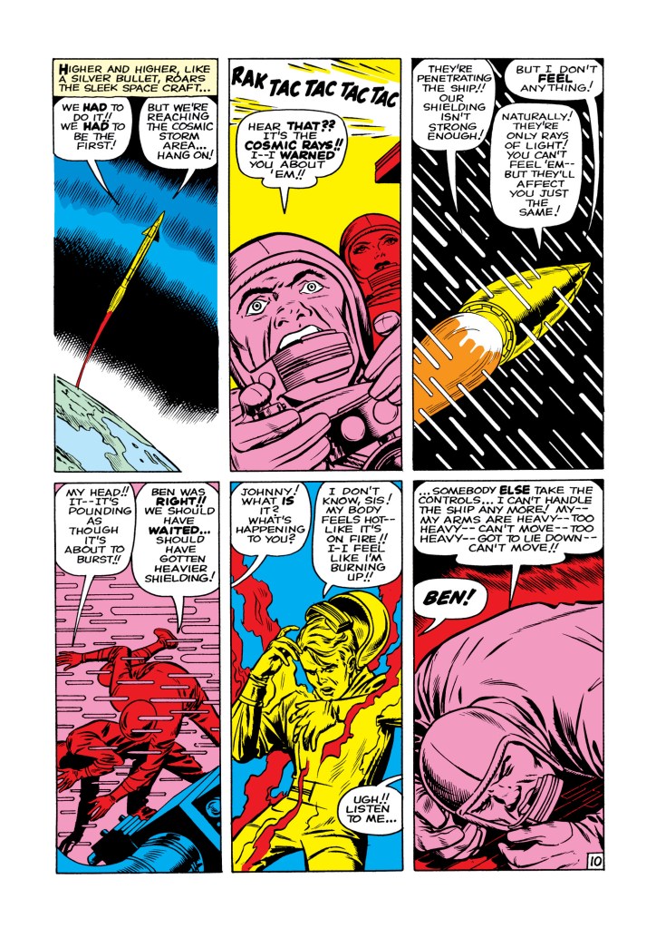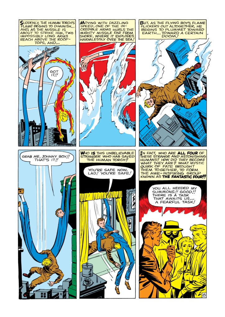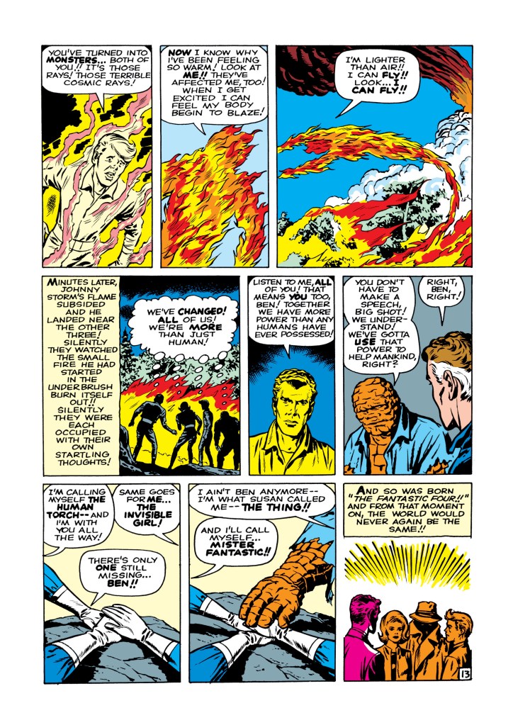 The four individuals traditionally associated with the Fantastic Four, who gained superpowers after exposure to cosmic rays during a scientific mission to outer space, are Mister Fantastic (Reed Richards), a scientific genius and the leader of the group, who can stretch his body into incredible lengths and shapes; the Invisible Girl (Susan “Sue” Storm; later “Invisible Woman”), who eventually married Reed, who can render herself invisible and later project powerful invisible force fields; the Human Torch (Johnny Storm), Sue’s younger brother, who can generate flames, surround himself with them and fly; and the monstrous Thing (Ben Grimm), their grumpy but benevolent friend, a former college football star and Reed’s college roommate as well as a good pilot, who possesses tremendous superhuman strength, durability, and endurance due to the nature of his stone-like flesh.
