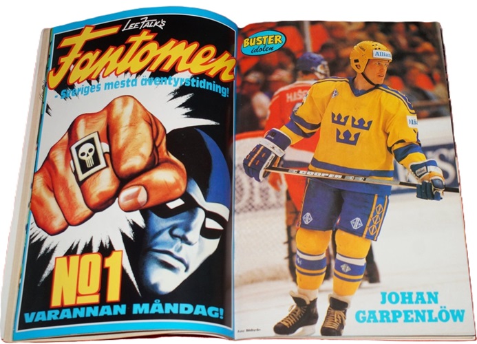 The Phantom makes an appearance in Buster Magazine edition number 9, published by Semic Press in Sweden in 1991. The Buster Magazine series this edition is a part of commenced in 1970 and ended in 1997. A total of 584 editions were released with the publisher resetting the edition number on a yearly basis. The magazine contains a mix of comic strip stories and general interest articles, all themed around sports.