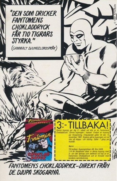 3:-BACK! This one coupon gives you a 3:- discount on the purchase of a Fantomen’s Chocolate Drink. Leave the coupon at the till. Only one coupon per pack. The offer is valid until 15 November 1991. Please copy the coupon if you do not want to cut it in your newspaper. Valid once per household.