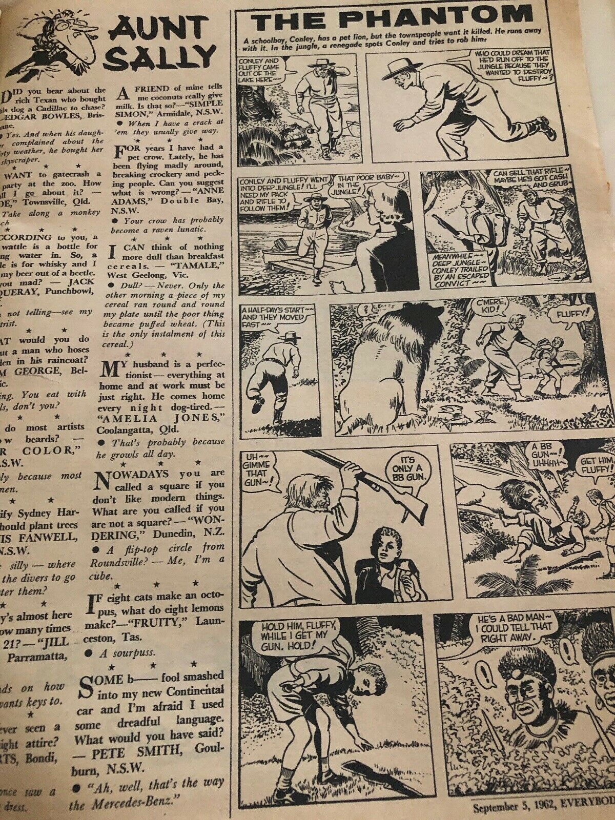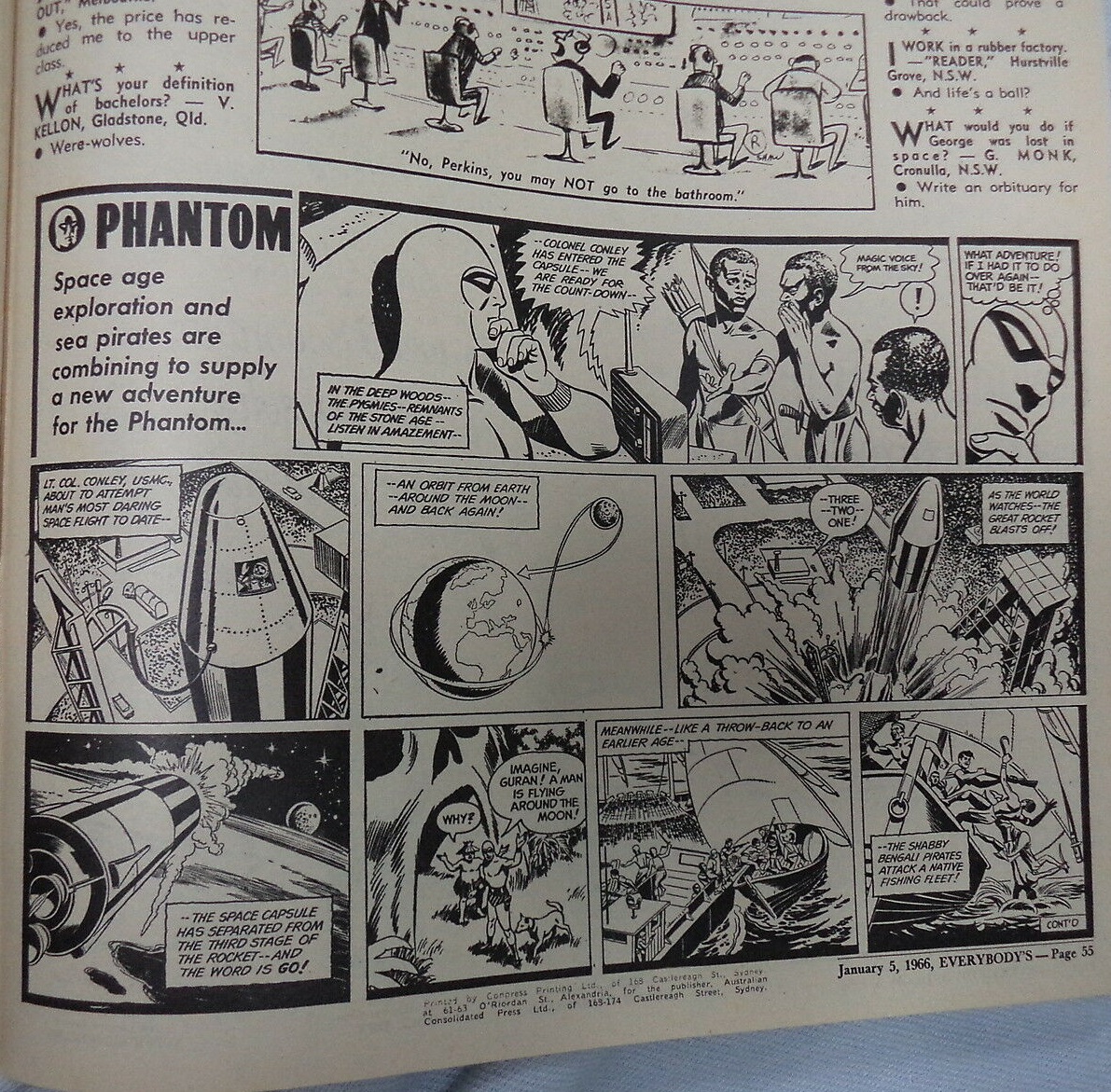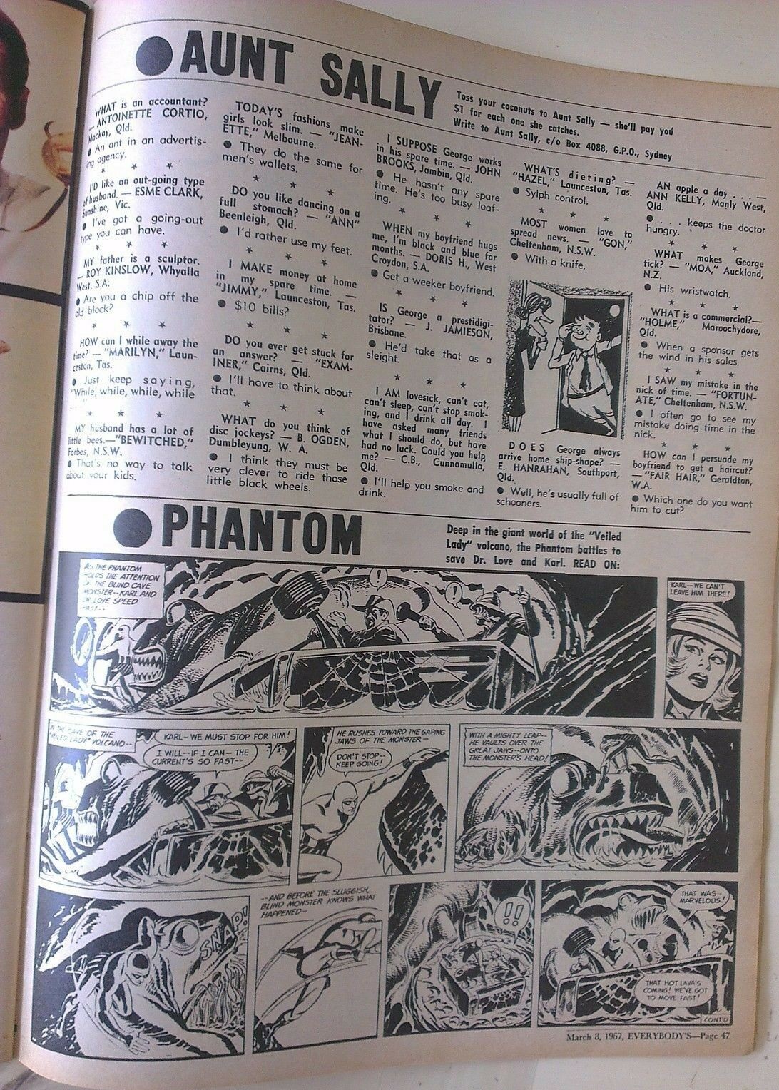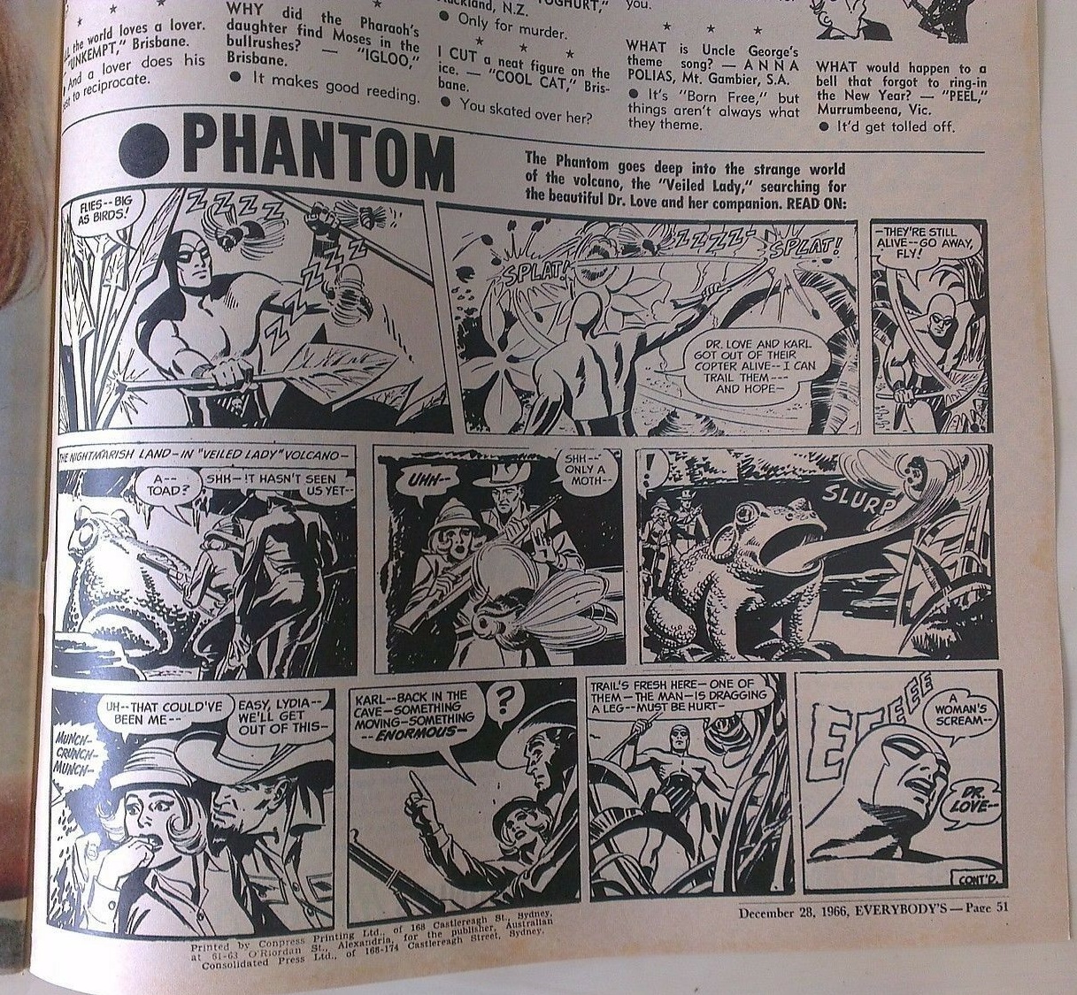 Phantom comic strips appeared in Everybody’s Magazine commencing 1961, basically taking over from where The Australian Woman’s Magazine left of. 13 or 14 Phantom stories were printed in black and white, covering half-a-page in each edition.