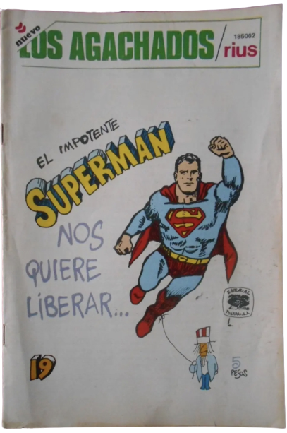 Los Agachados edition number 19 was published on the 18th of July, 1979. It contains an image of Superman on the front cover, with a title of ‘El Impotente Superman Nos Quiere Liberar’, which translates to ‘The Powerless Superman Wants To Free Us’.