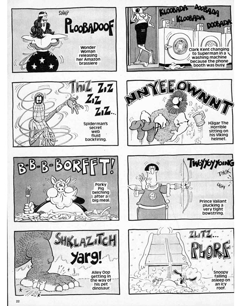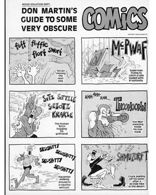 The MAD Magazine published as part of the regular series contains 52 black and white pages. It includes a 3 page parody section titled ‘Don Martin’s Guide to Some Very Obscure Comics Sound Effects’, written by Don Edwing and illustrated by Don Martin.