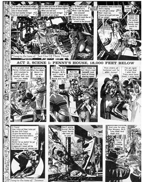 The comic strip story is based on a parody of a Broadway musicals using comic strip characters, with Rex Morgan kidnapping Annie and intends to remove her unique eyes, but Sandy leads Dick Tracy and Tarzan to a rescue, which is aided by the Phantom, Snuffy Smith and others.