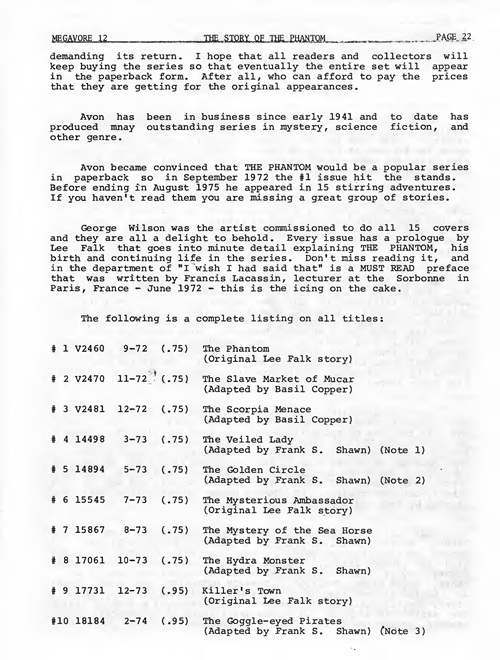An article appears in this edition titled ‘The Story Of The Phantom’ by Melville C. Hill, commencing on page 21 and spanning three pages, provides a detailed exploration of the Phantom’s creator, Lee Falk, as well as an overview of the storybooks published by Avon in the United States beginning in 1972, which encompass a total of 15 editions.