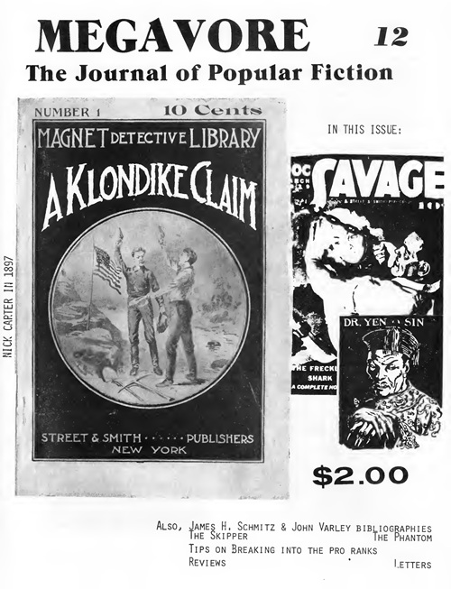 Megavore issue number 12, with the subtitle ‘The Journal Of Popular Fiction’, was released in December 1980 containing 46 black and white pages measuring 8.5” x 11”. The front and back covers can be seen below.