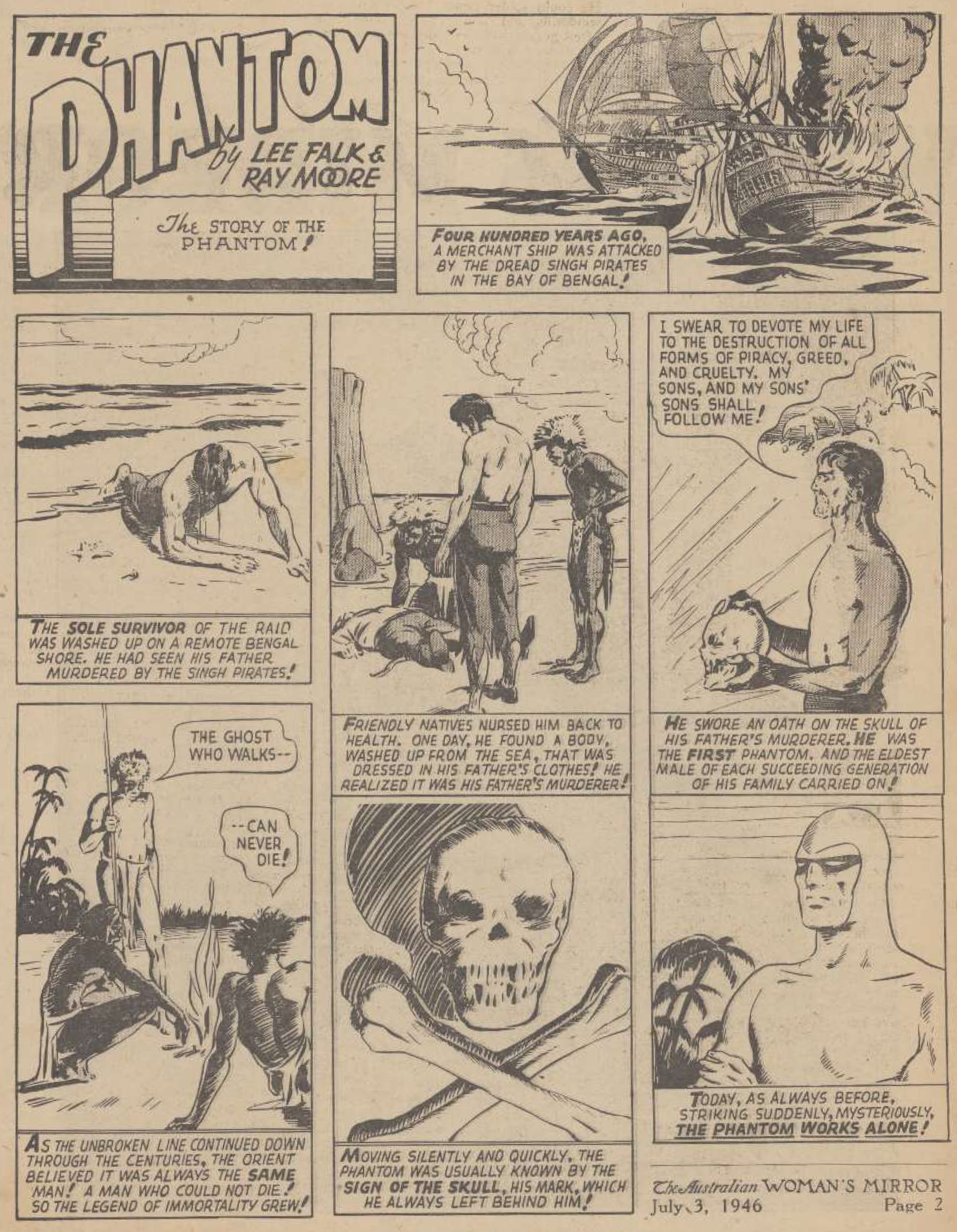 The Phantom comic strip made its first appearance in Australia on the 1st of September 1936, only 8 months after the Phantom first appeared in USA. In The Australian Woman’s Mirror on page 49, in Volume 12, Number 41, we see a full page Phantom comic strip, the commencement of ‘The Singh Brotherhood’.