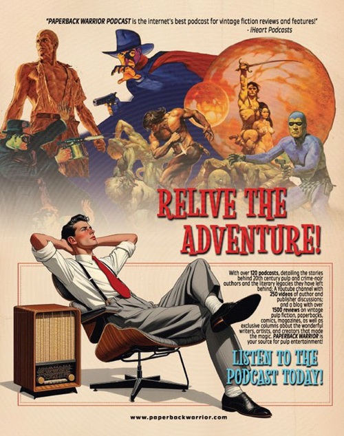 The back cover features an advertisement created by Bill Cunningham for the Paperback Warrior Podcast. It presents a collage comprising an extensive array of characters depicted by numerous artists, including Doc Savage, The Shadow, The Green Hornet, Tarzan, and John Carter. Additionally, the collage incorporates an image of the Phantom.