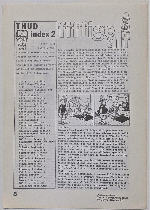 The THUD Fanzine Series was published by Seriefrämjandet in Sweden, founded in 1968 by Henri Holmgren, Janne Lundström and Sture Hegerfors. The first edition was published in March, 1968 with 34 editions published under the THUD title.
