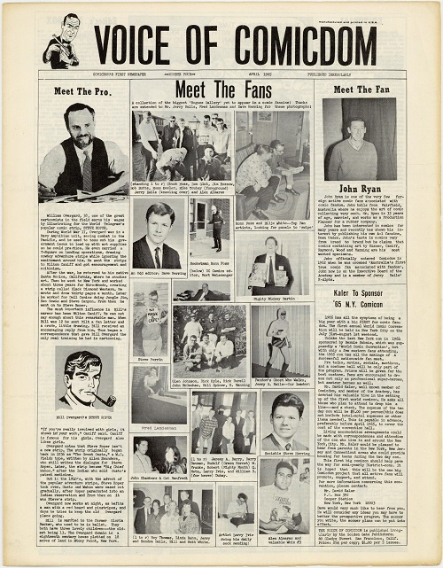 Published in black and white (except for edition numbers 16 and 17 which came with a wrap around color cover), Voice of Comicdom advertised itself as ‘Comicdom’s First Newspaper’ which was ‘Published Irregularly’. The size altered slightly over the 17 editions, initially measuring 10″ x 14″, with later editions measuring 8.5″ x 11″.