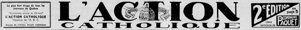 L’Action Catholique was a daily newspaper (except Sunday’s) founded in Quebec, Canada on the 21st of December, 1907. The newspaper was initially titled L’Action Sociale, but renamed to L’Action Catholique on the 9th of June, 1915. It printed it’s last newspaper on the 15th of August, 1962 under the title of L’Action Catholique.