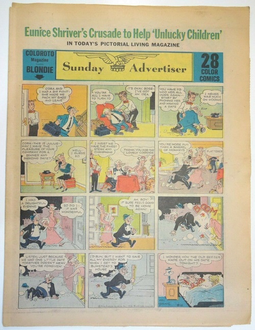 A variety of comic strips were featured in the Sunday lift-out, which was published in full color. The comic strip characters include Blondie, Steve Canyon, Popeye, Bringing Up Father, Buz Sawyer, Donald Duck, Hi and Lois, Prince Valiant, Archie, Katzenjammer, Kids Hubert, Beetle Bailey, Flash Gordon, Little Iodine, Henry, Mickey Mouse, Uncle Remus and many more. The line-up of comic strips varied from edition to edition.