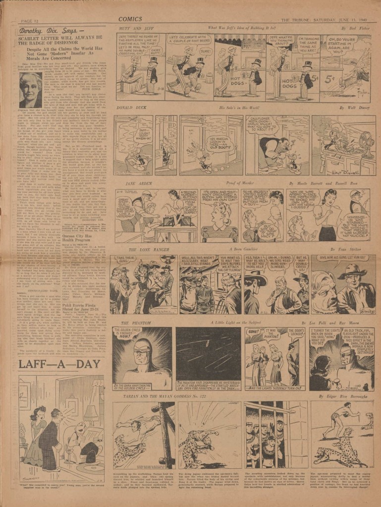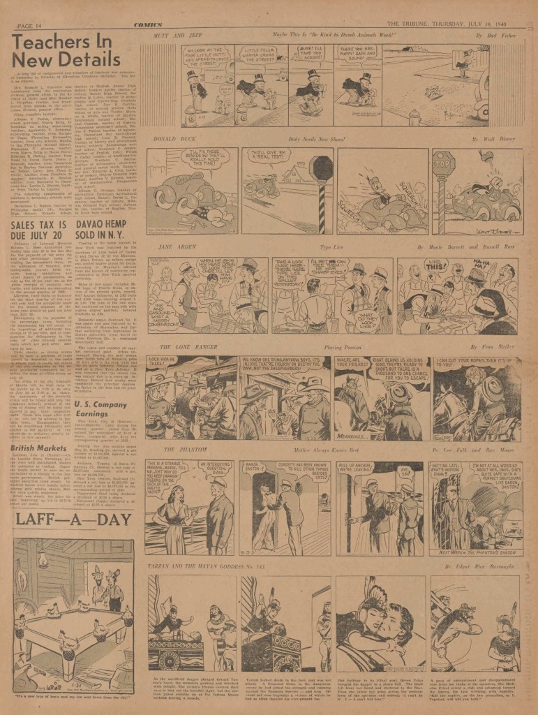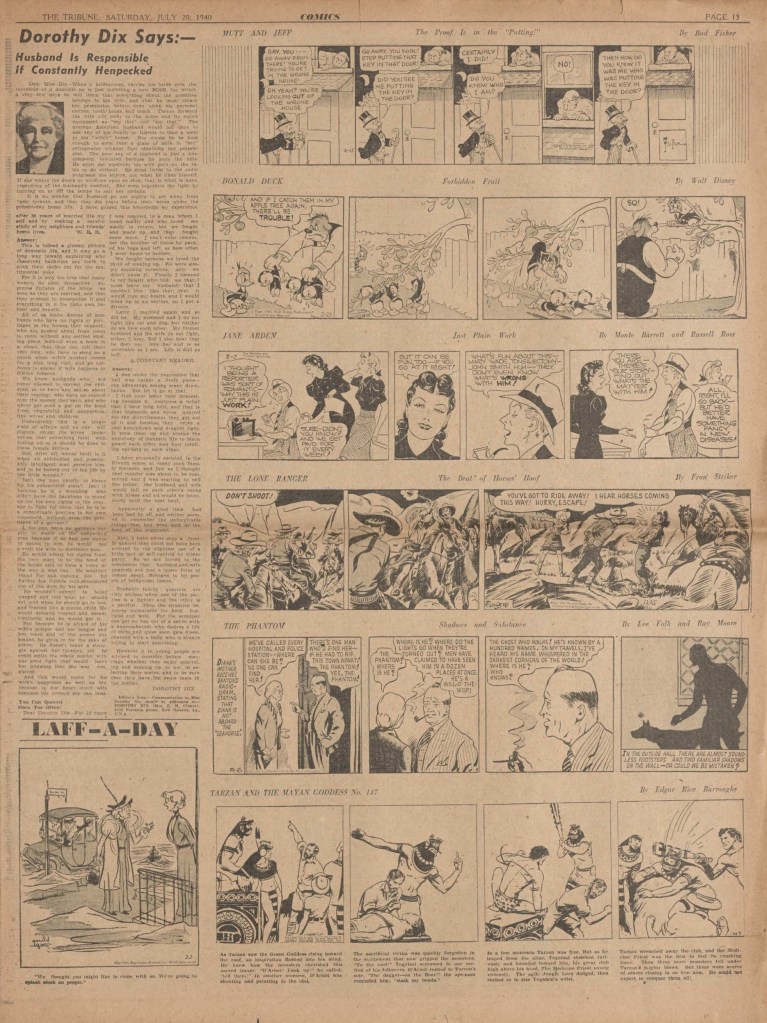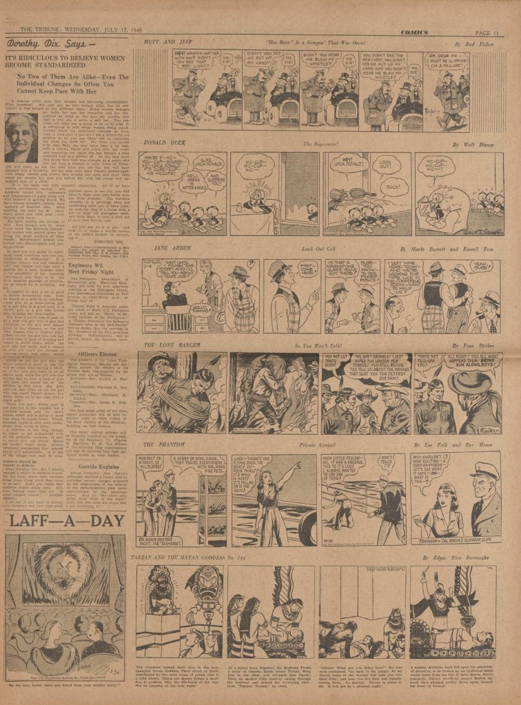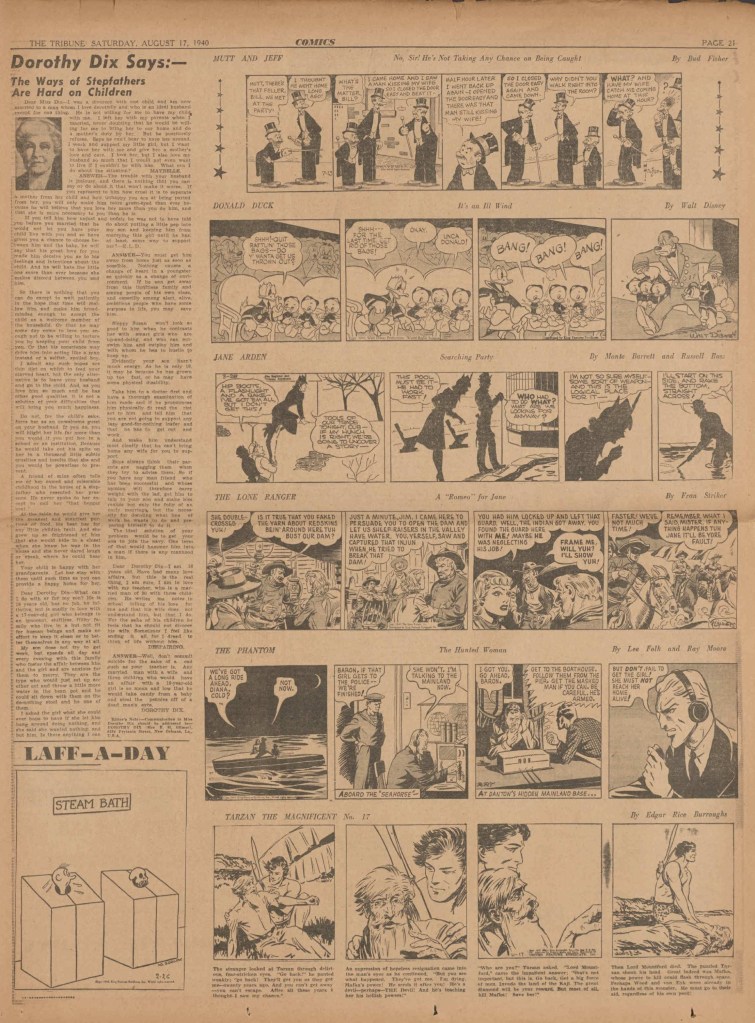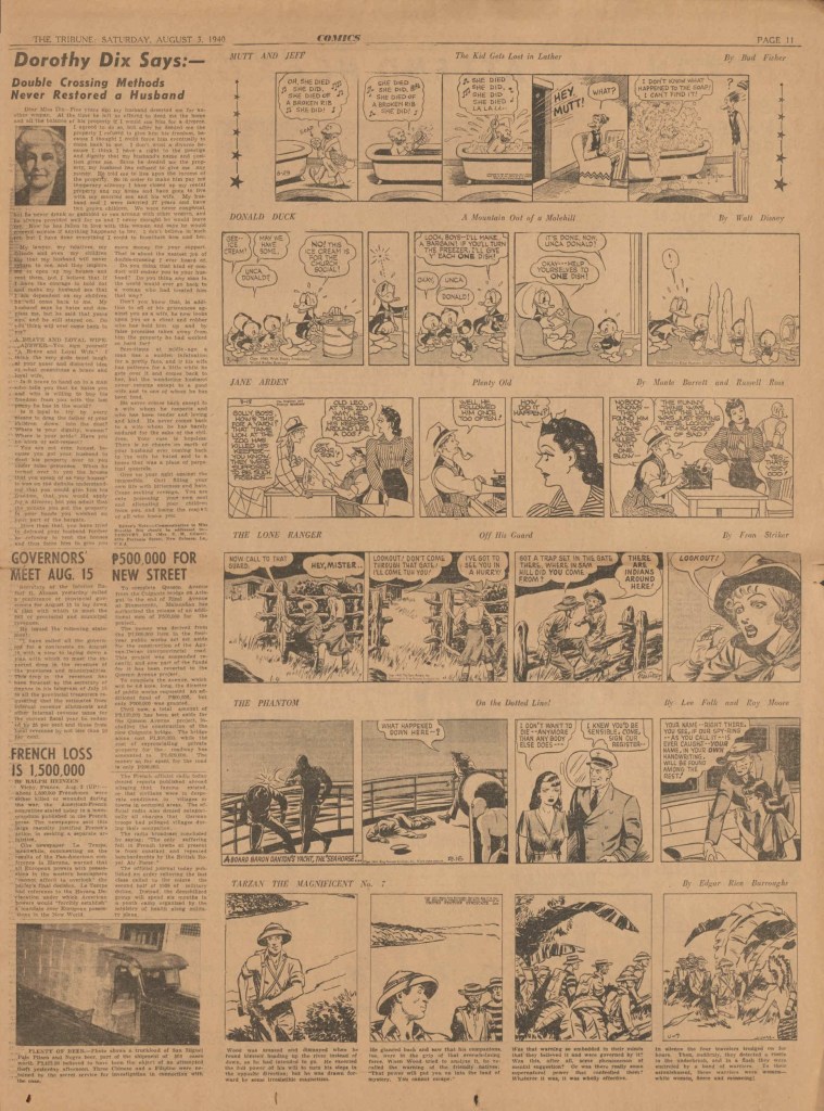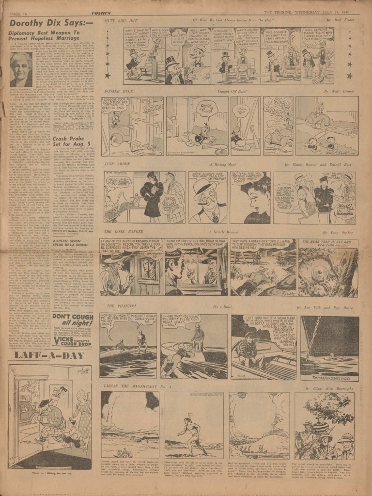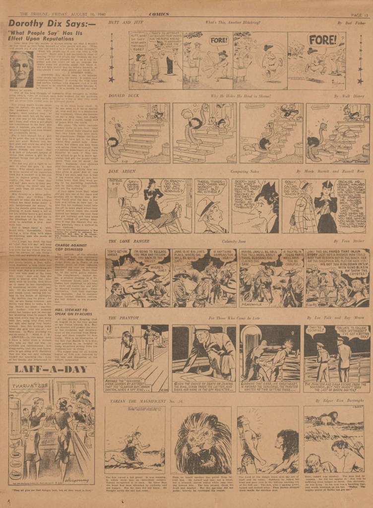 On the weekend, a special comic lift-out was published in full color, running for 16 pages and containing comic characters such as Tarzan, The Lone Ranger, The Captain and The Kids, Henry, Prince Valiant and more. See below an example of the weekend lift-out.