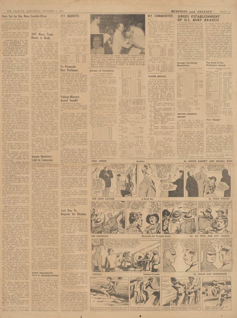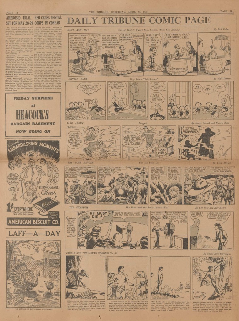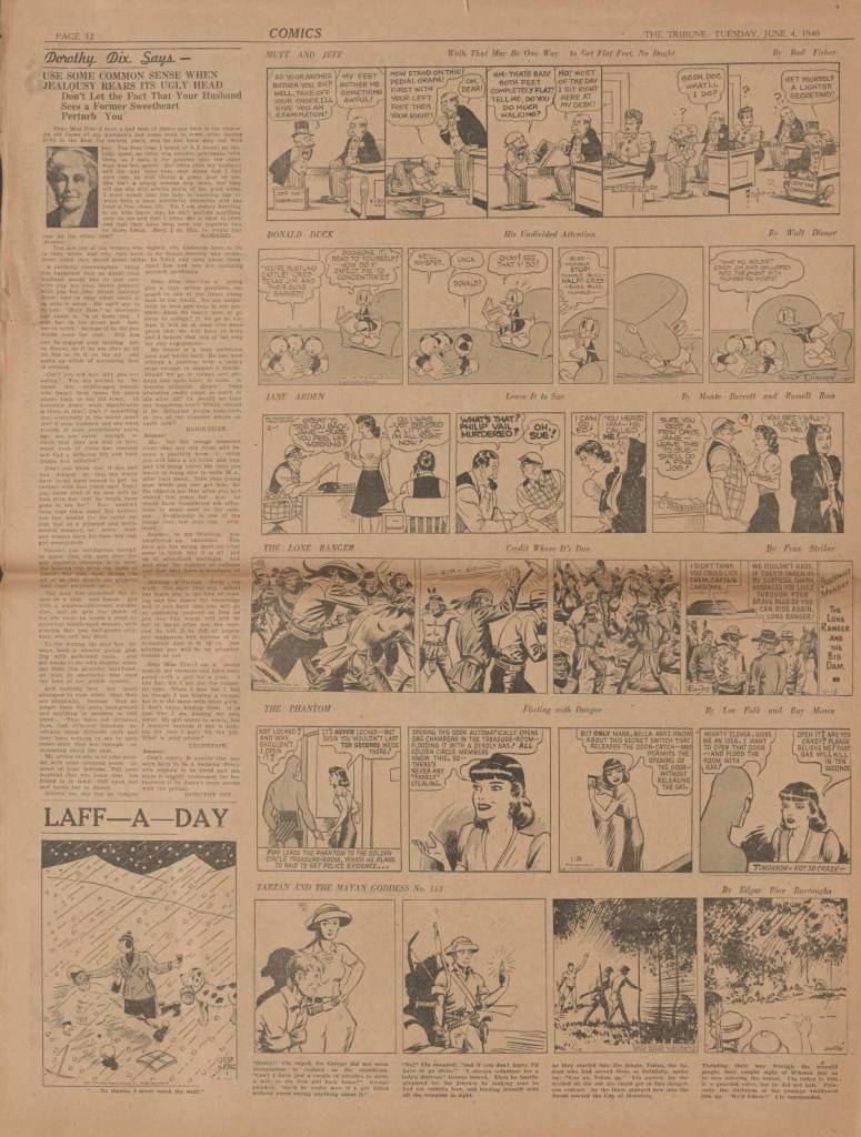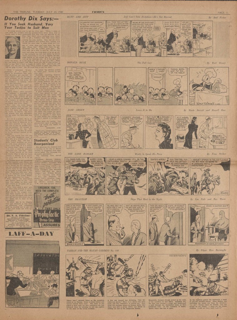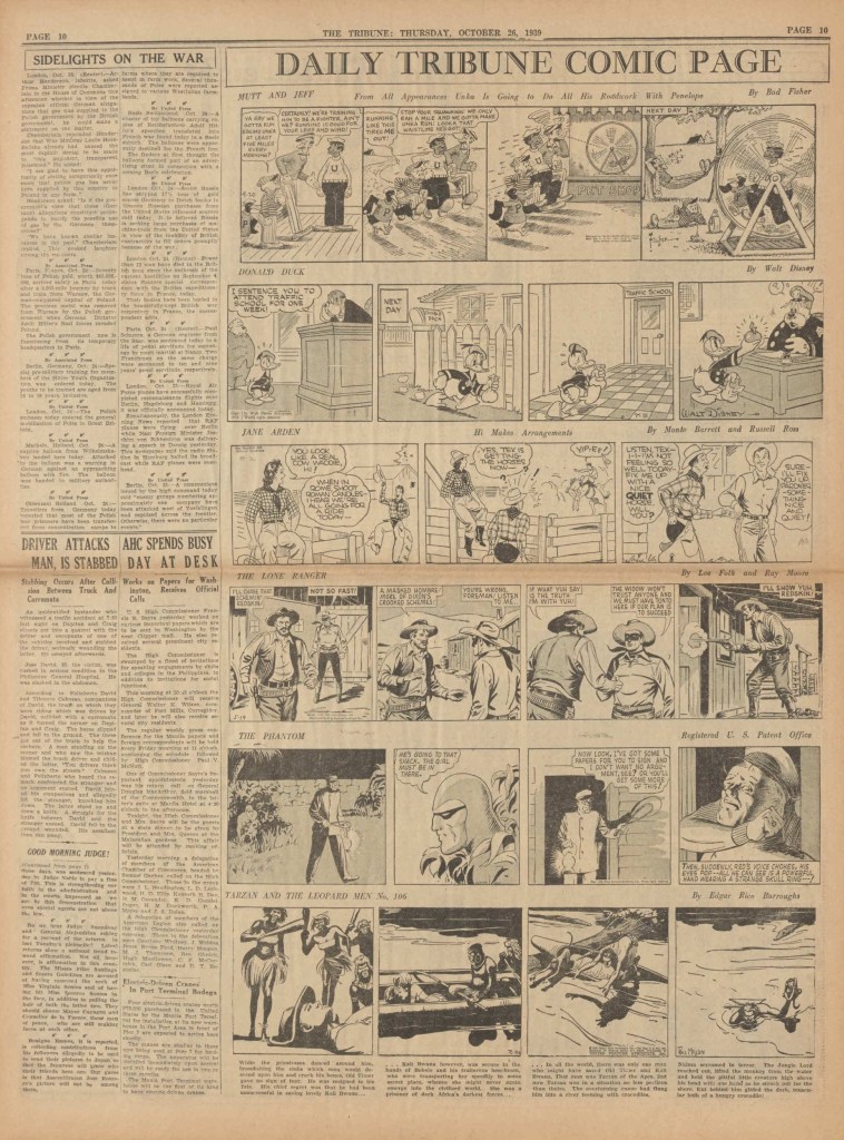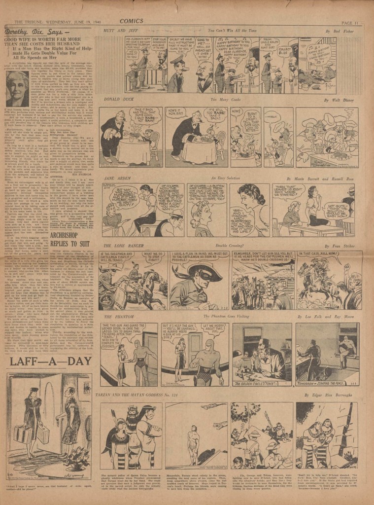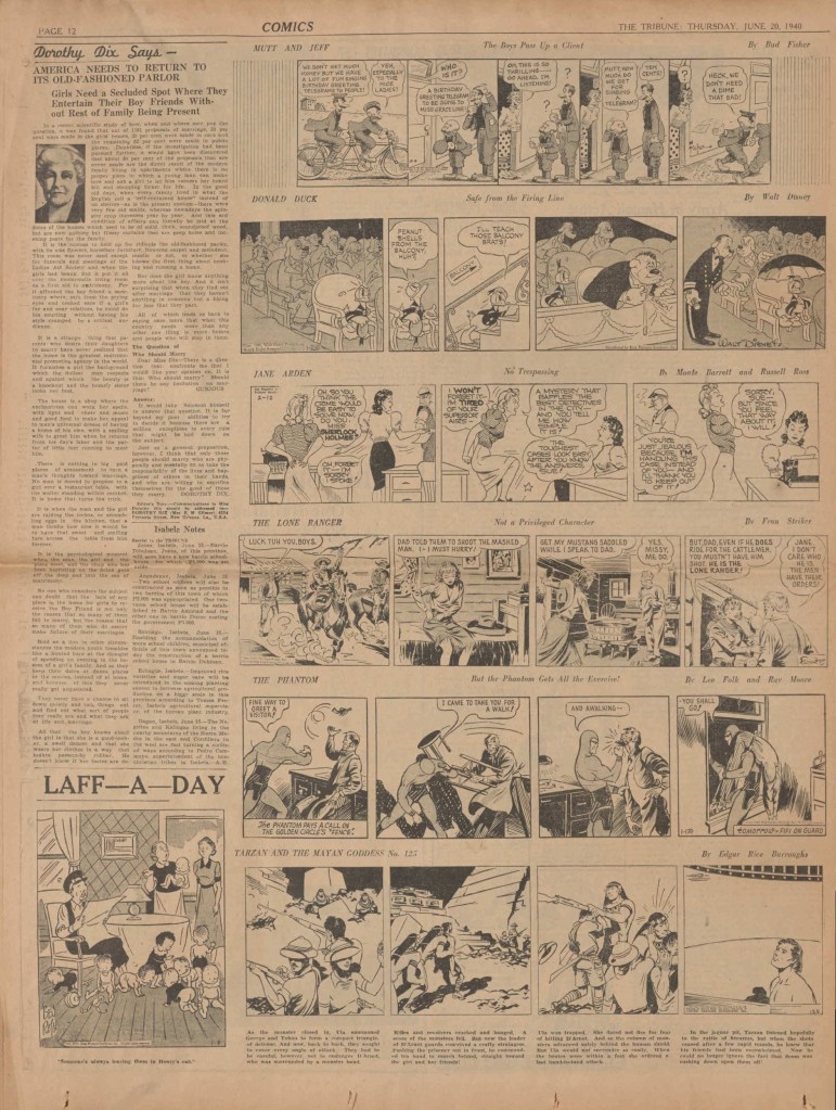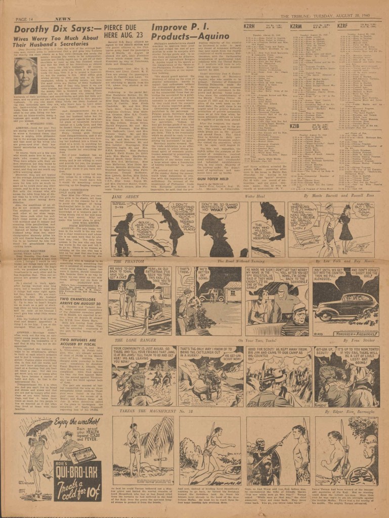 On the weekend, a special comic lift-out was published in full color, running for 16 pages and containing comic characters such as Tarzan, The Lone Ranger, The Captain and The Kids, Henry, Prince Valiant and more. See below an example of the weekend lift-out.