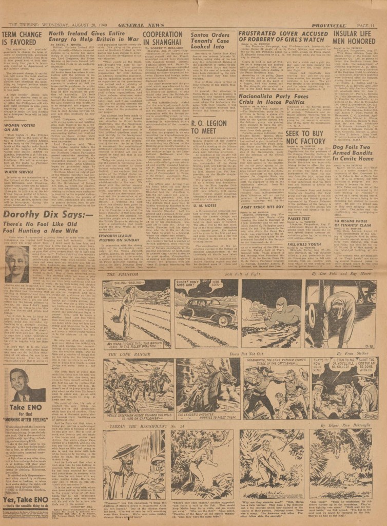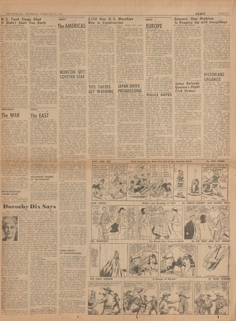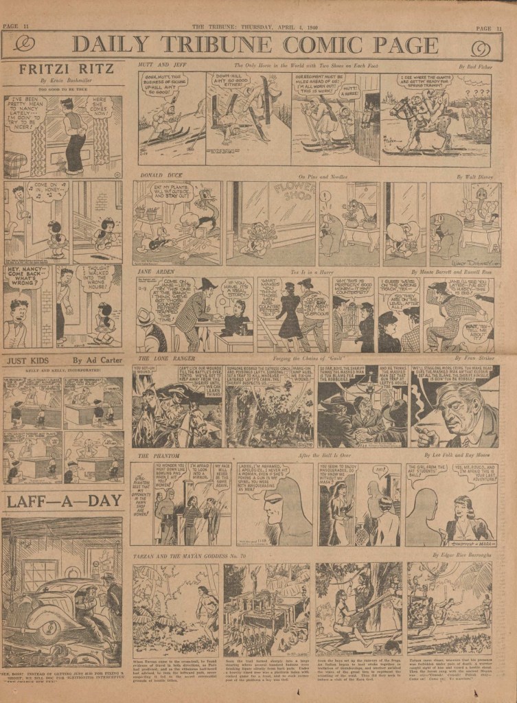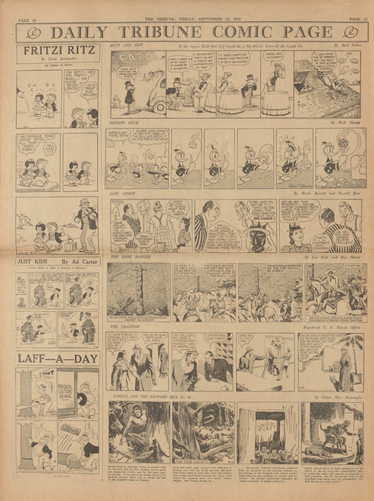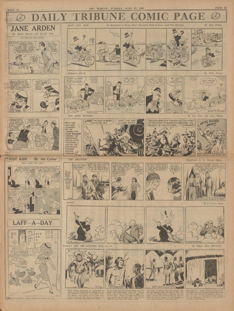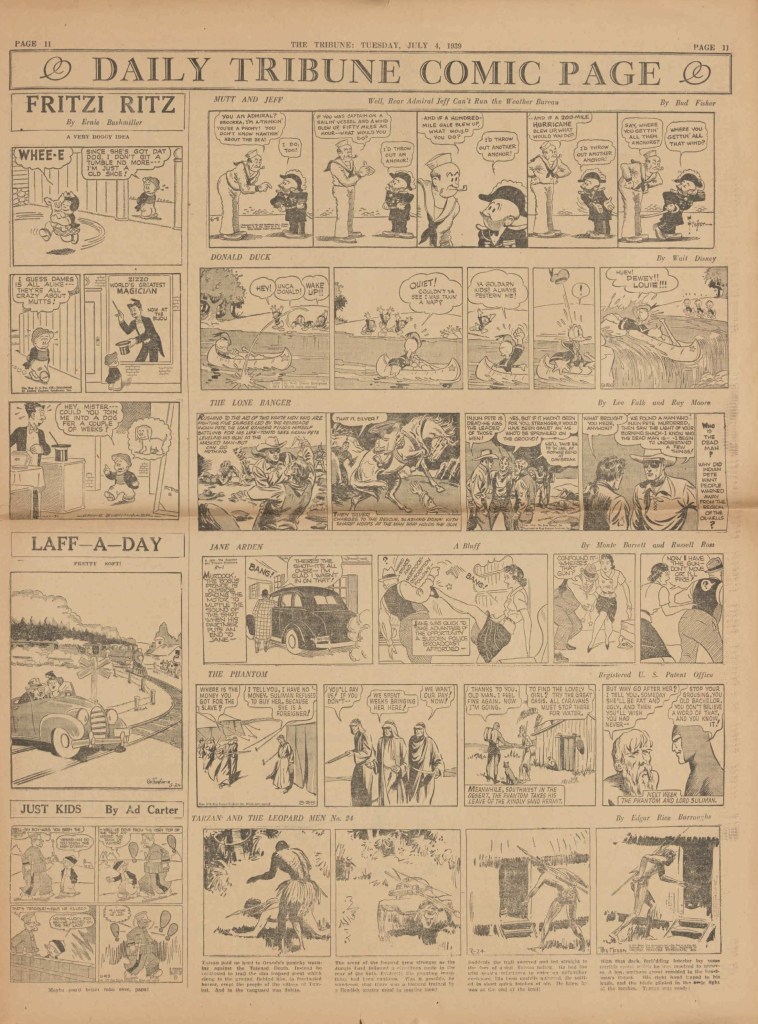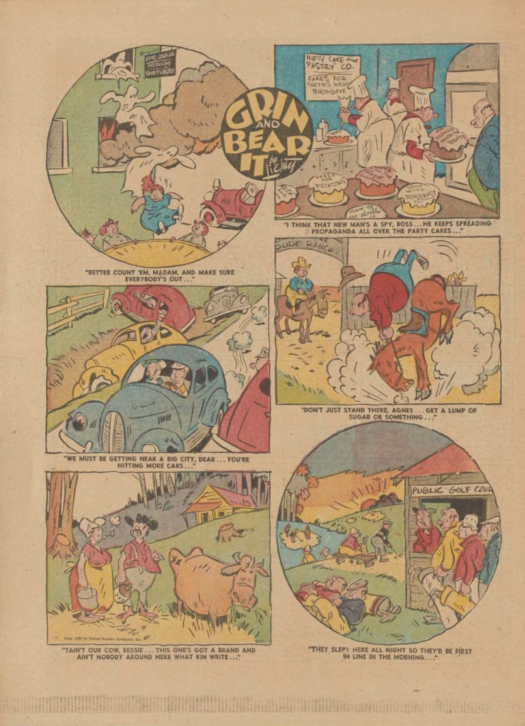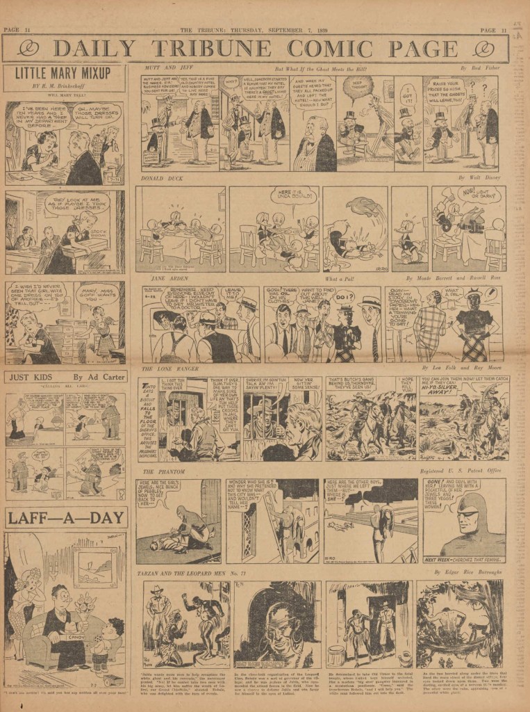 On the weekend, a special comic lift-out was published in full color, running for 16 pages and containing comic characters such as Tarzan, The Lone Ranger, The Captain and The Kids, Henry, Prince Valiant and more. See below an example of the weekend lift-out.