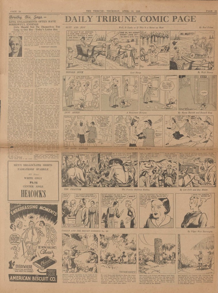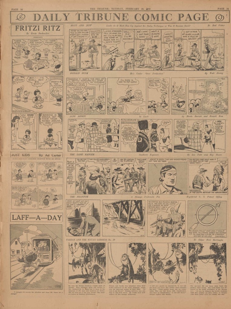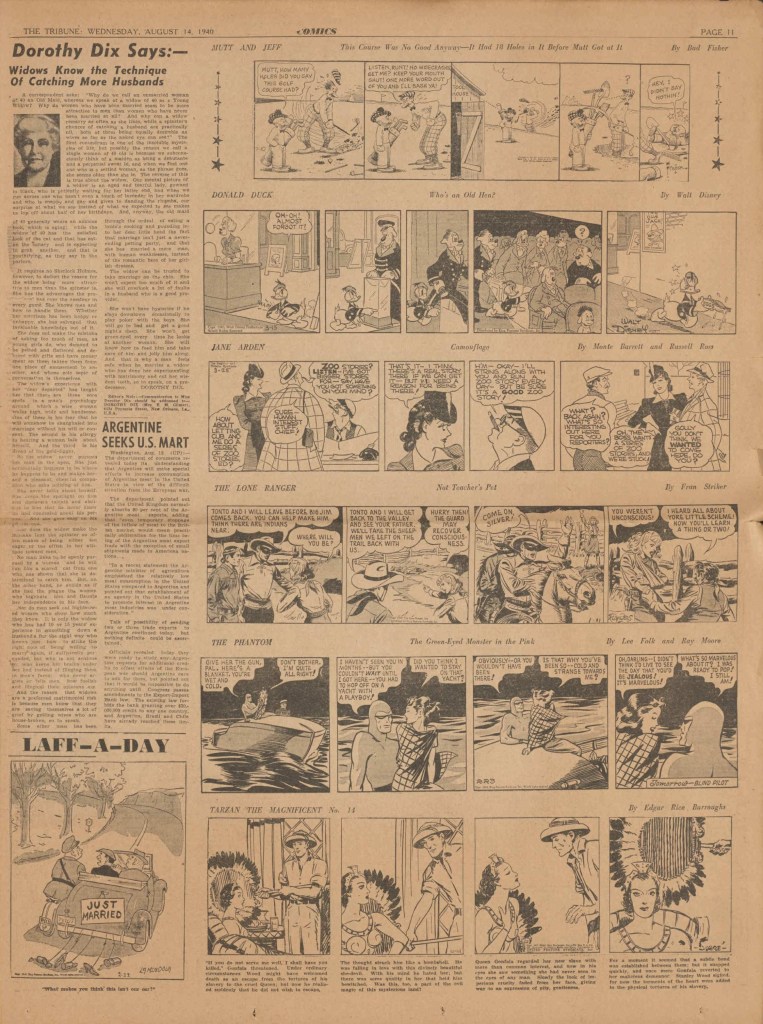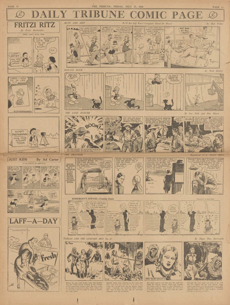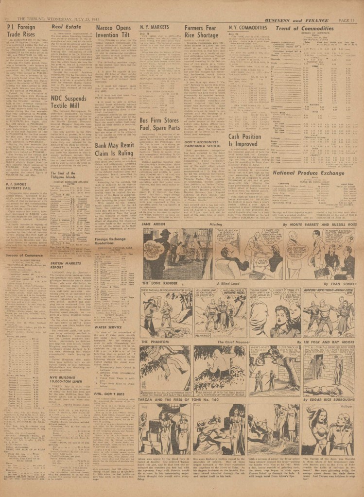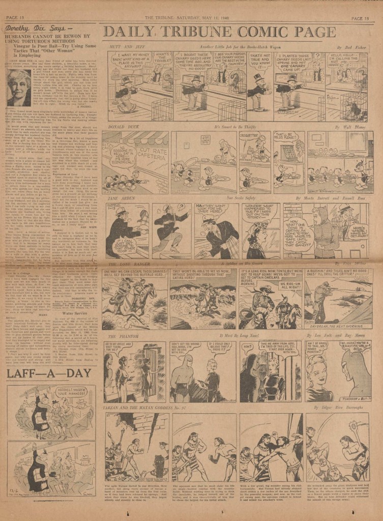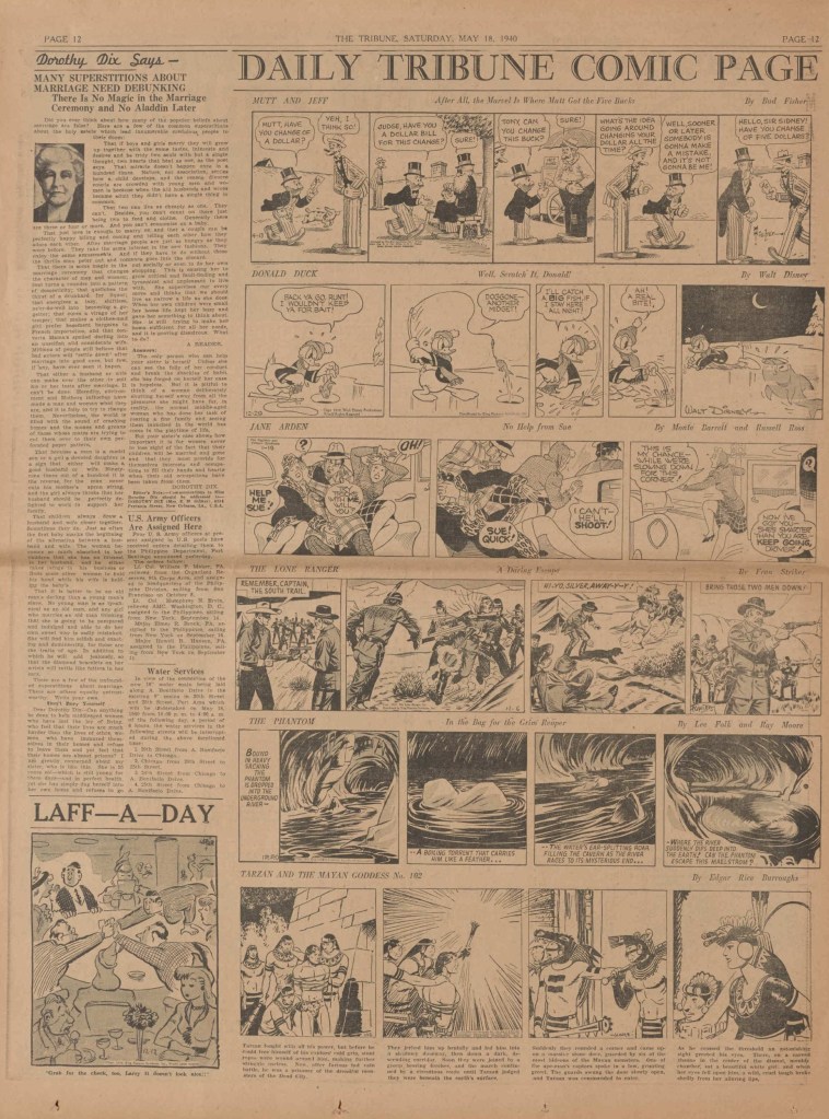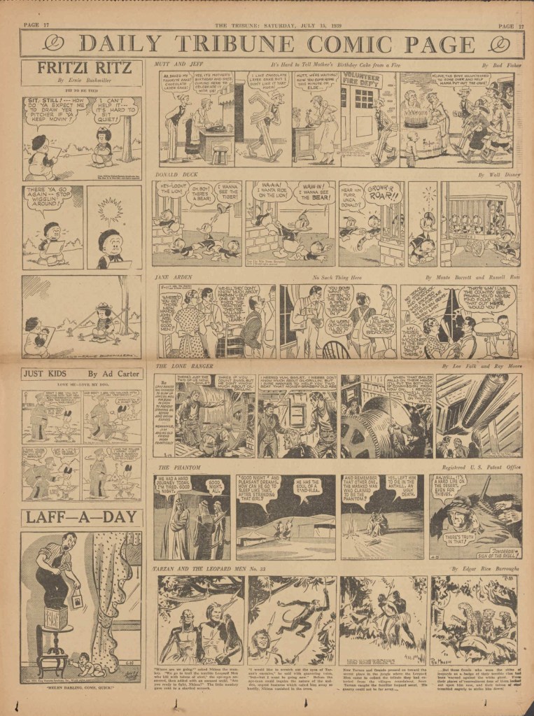On the weekend, a special comic lift-out was published in full color, running for 16 pages and containing comic characters such as Tarzan, The Lone Ranger, The Captain and The Kids, Henry, Prince Valiant and more. See below an example of the weekend lift-out.