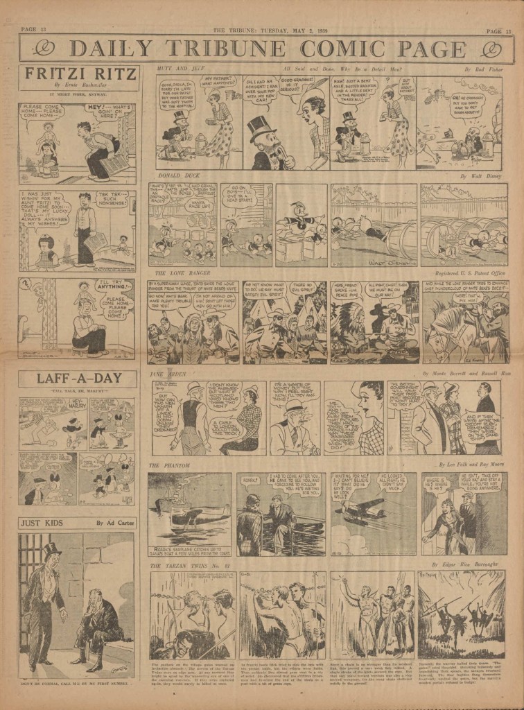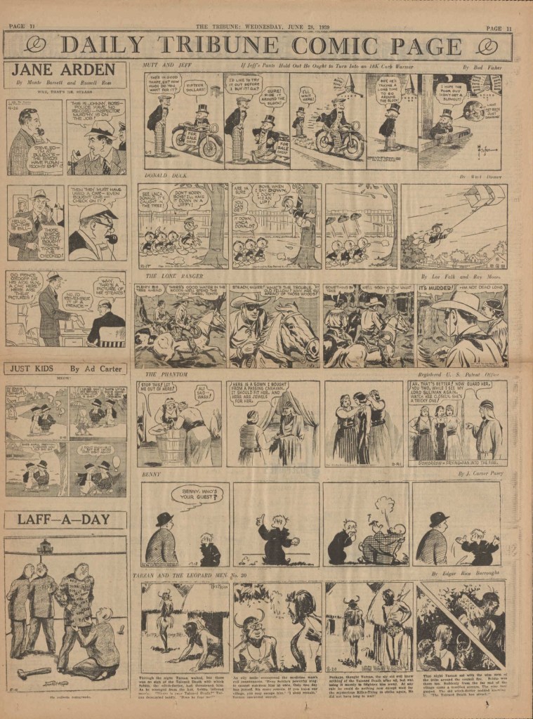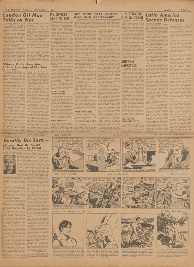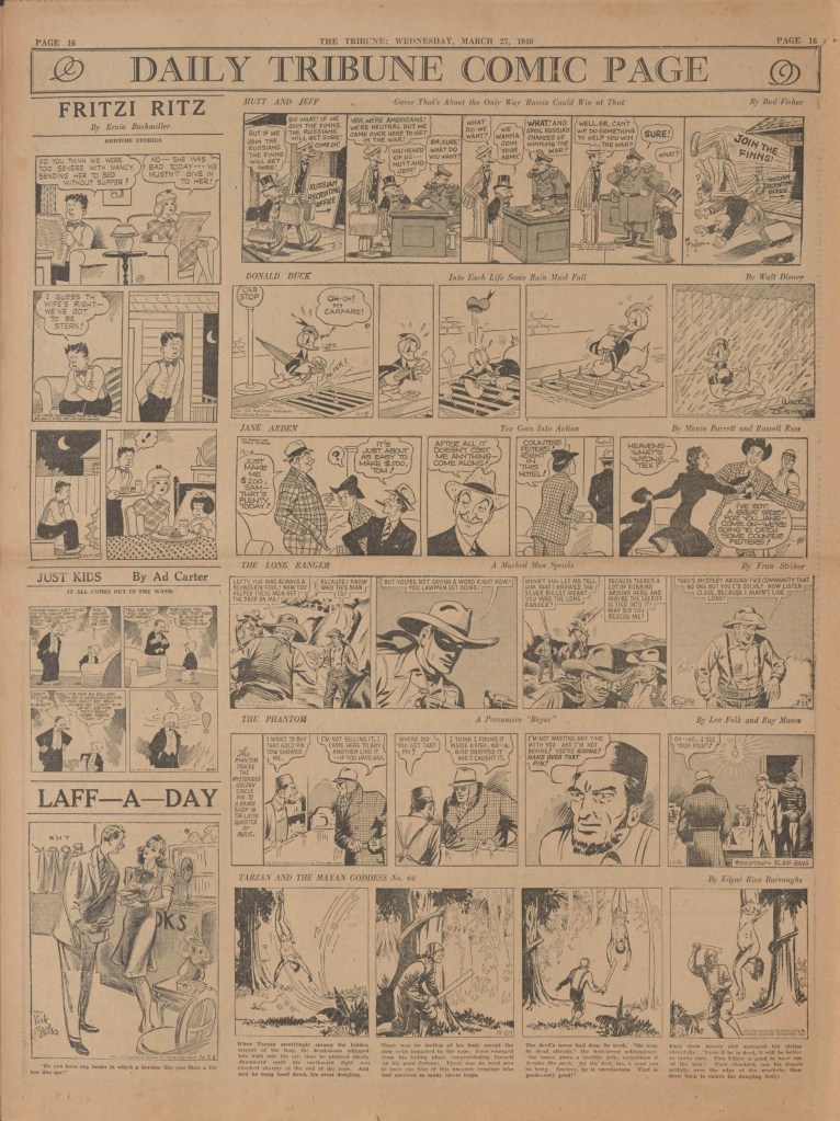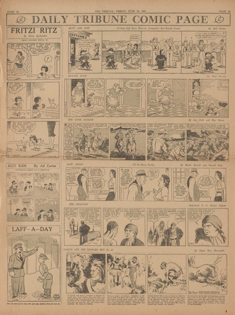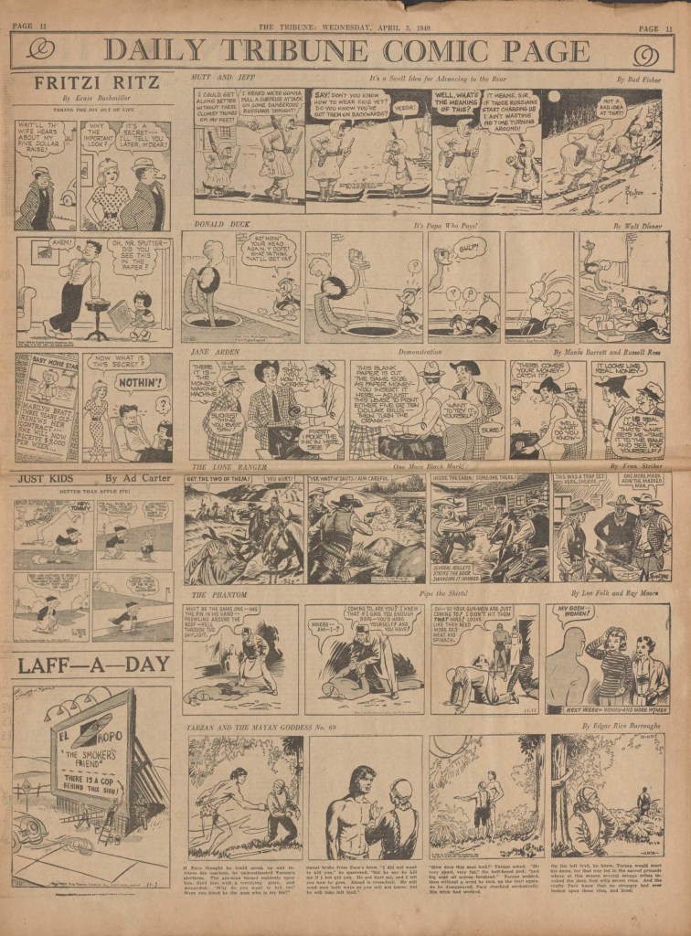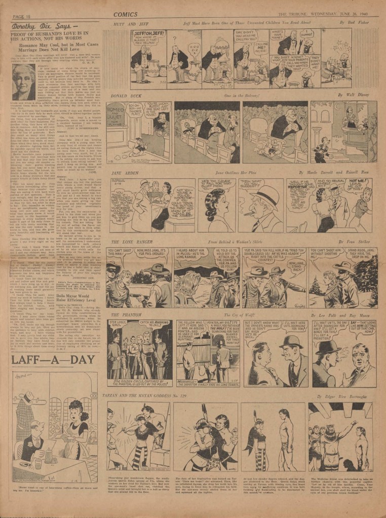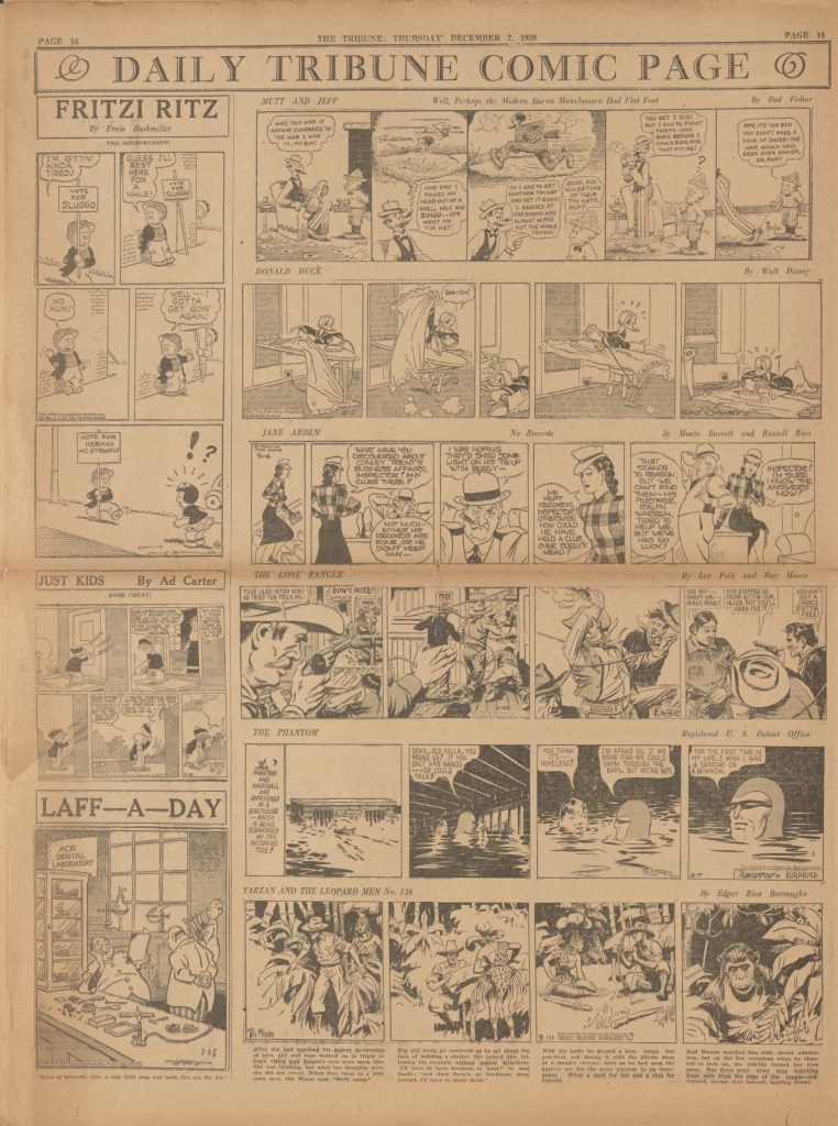 On the weekend, a special comic lift-out was published in full color, running for 16 pages and containing comic characters such as Tarzan, The Lone Ranger, The Captain and The Kids, Henry, Prince Valiant and more. See below an example of the weekend lift-out.