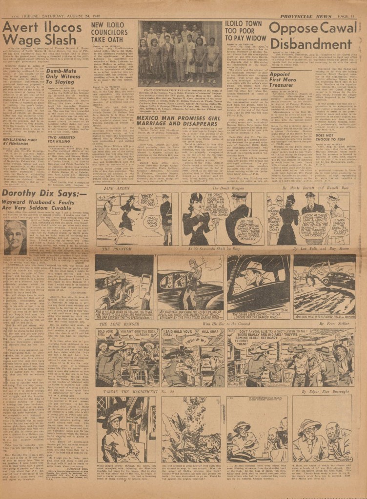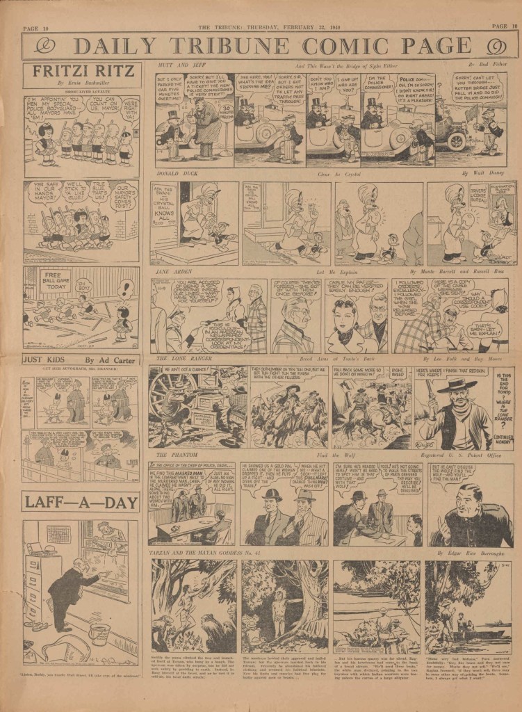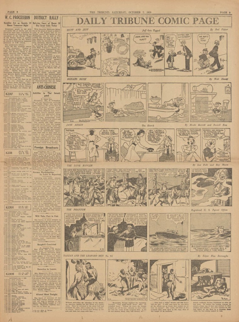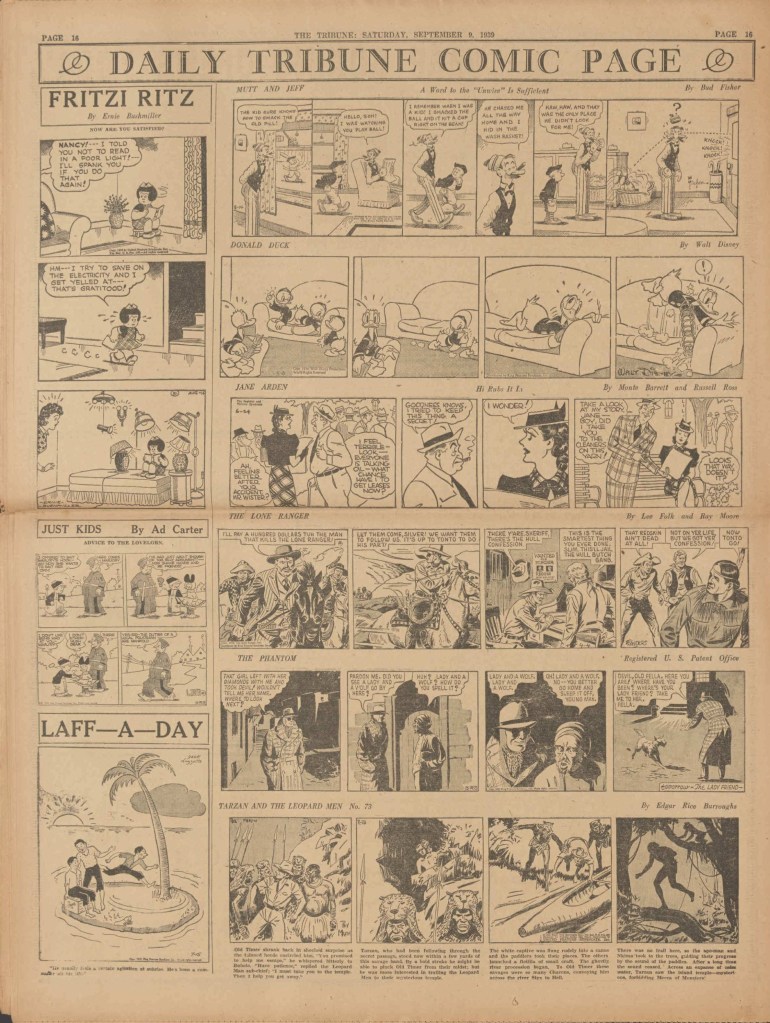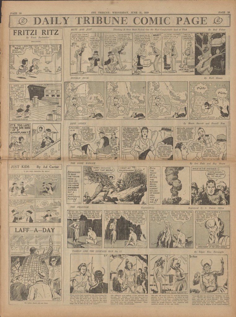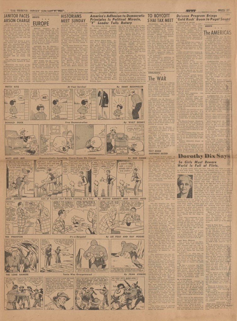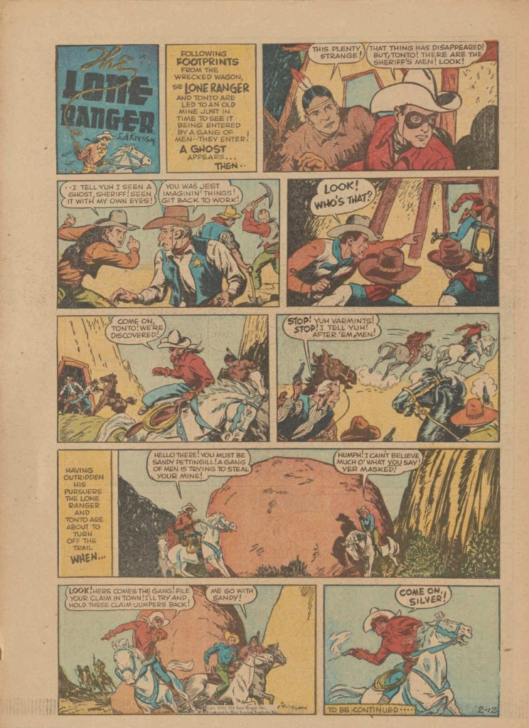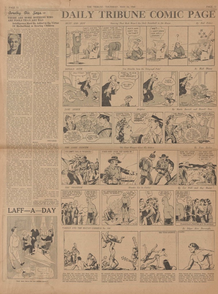 On the weekend, a special comic lift-out was published in full color, running for 16 pages and containing comic characters such as Tarzan, The Lone Ranger, The Captain and The Kids, Henry, Prince Valiant and more. See below an example of the weekend lift-out.