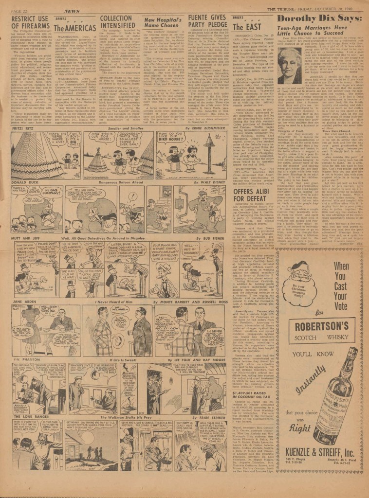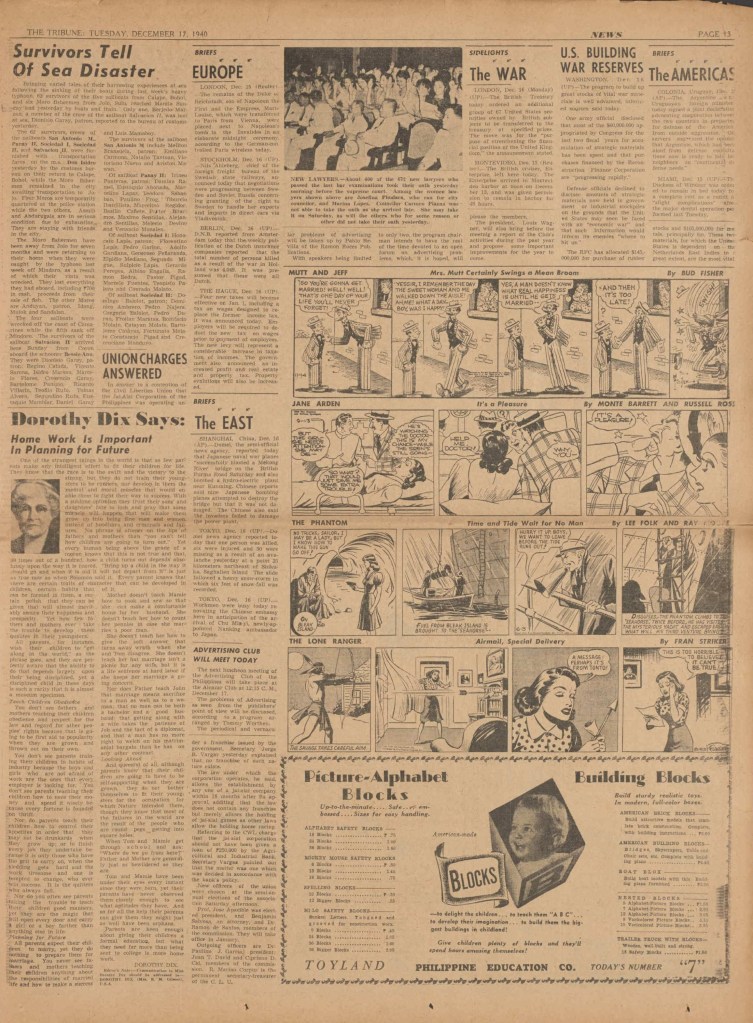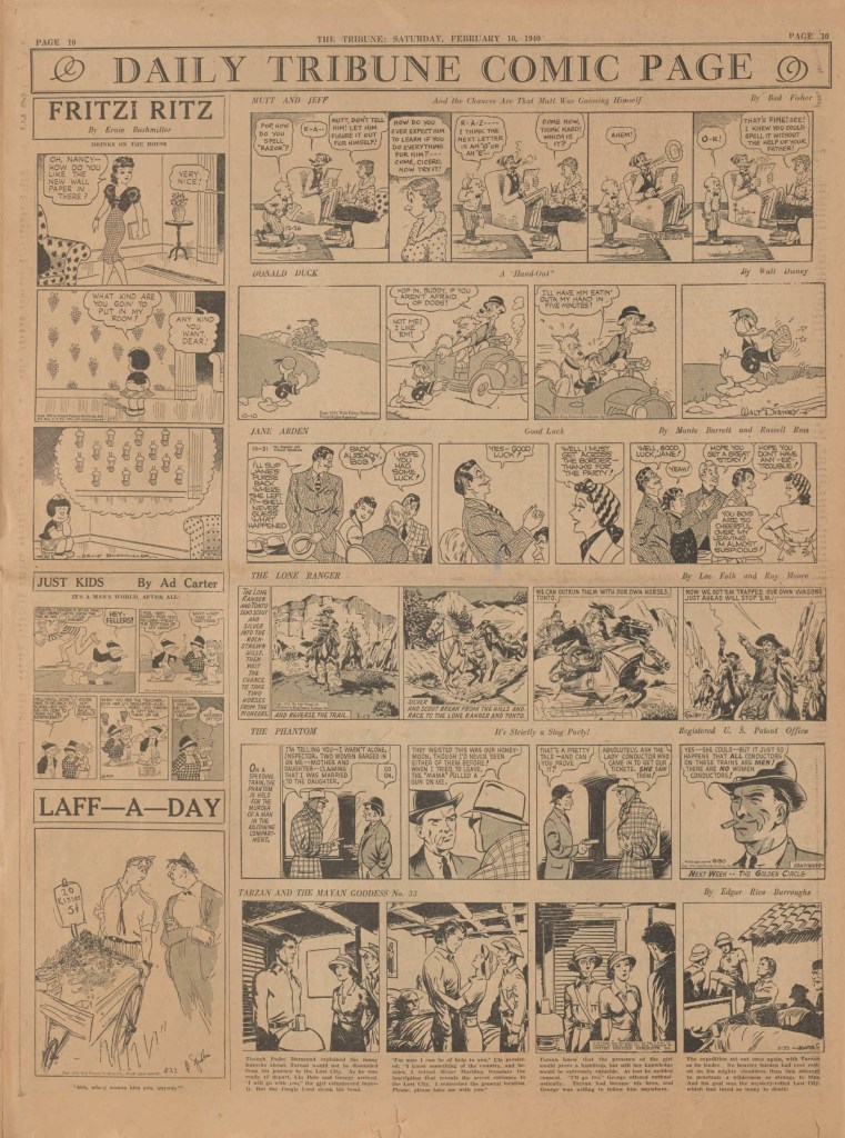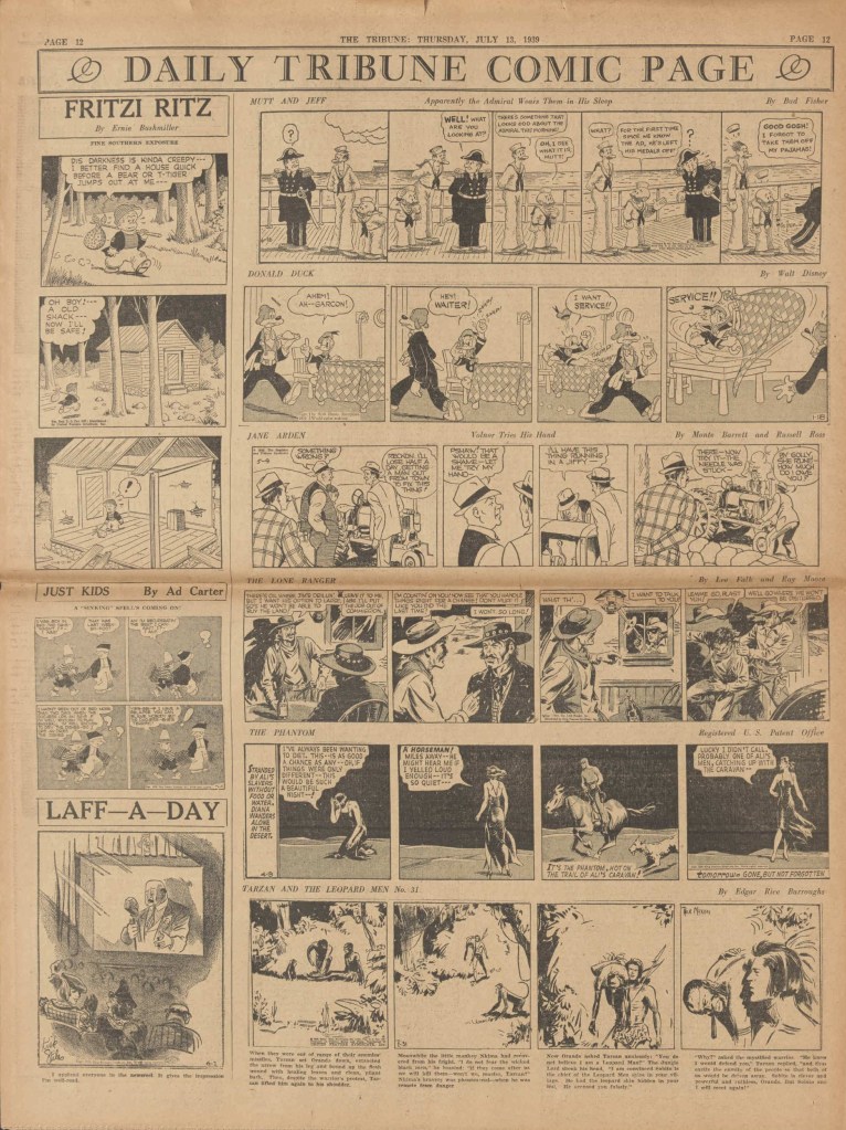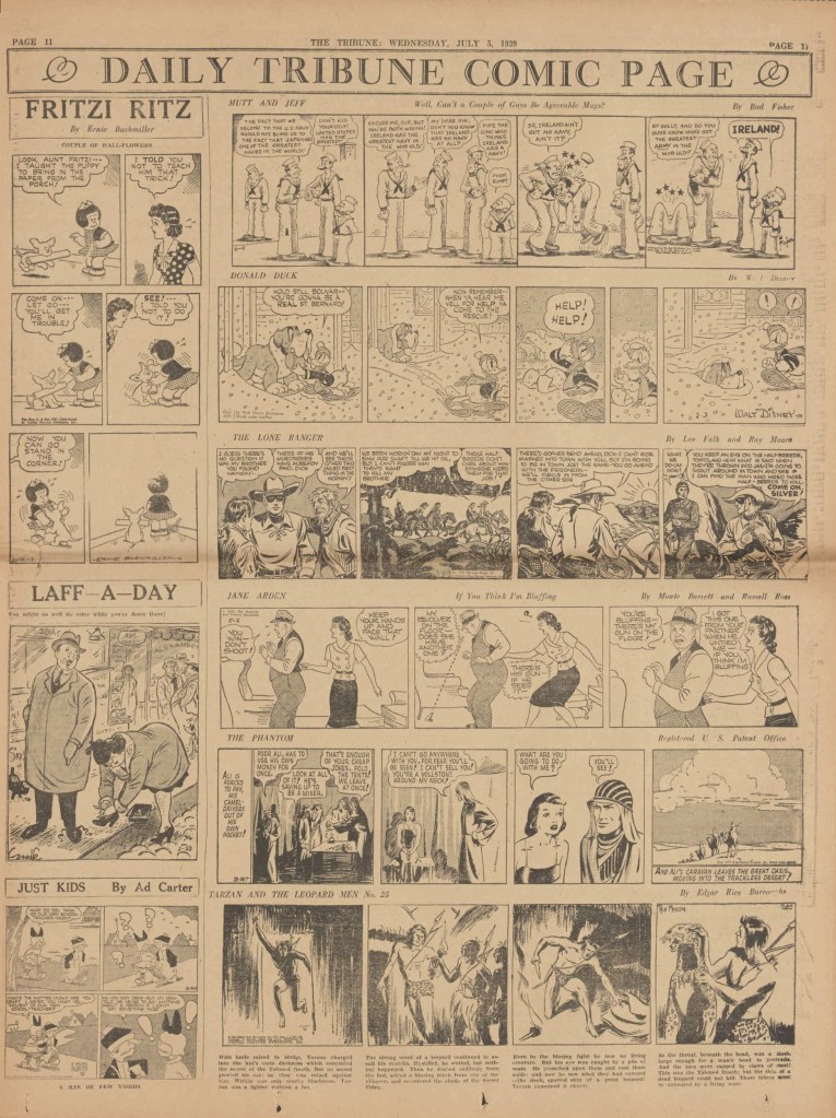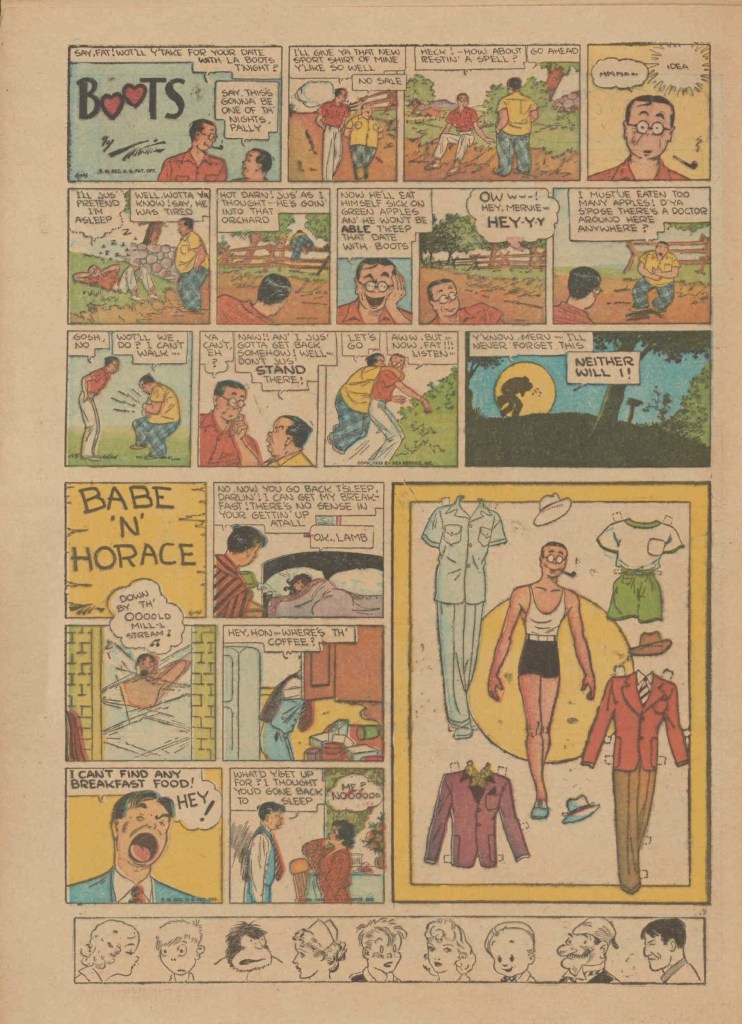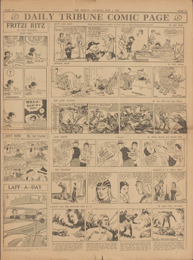 On the weekend, a special comic lift-out was published in full color, running for 16 pages and containing comic characters such as Tarzan, The Lone Ranger, The Captain and The Kids, Henry, Prince Valiant and more. See below an example of the weekend lift-out.