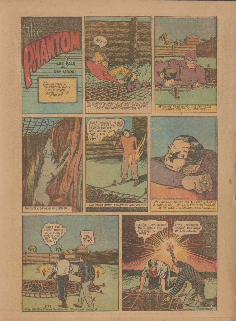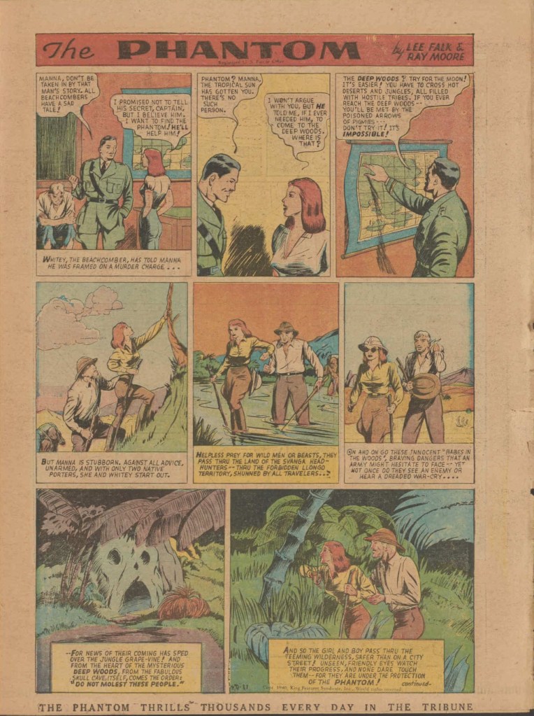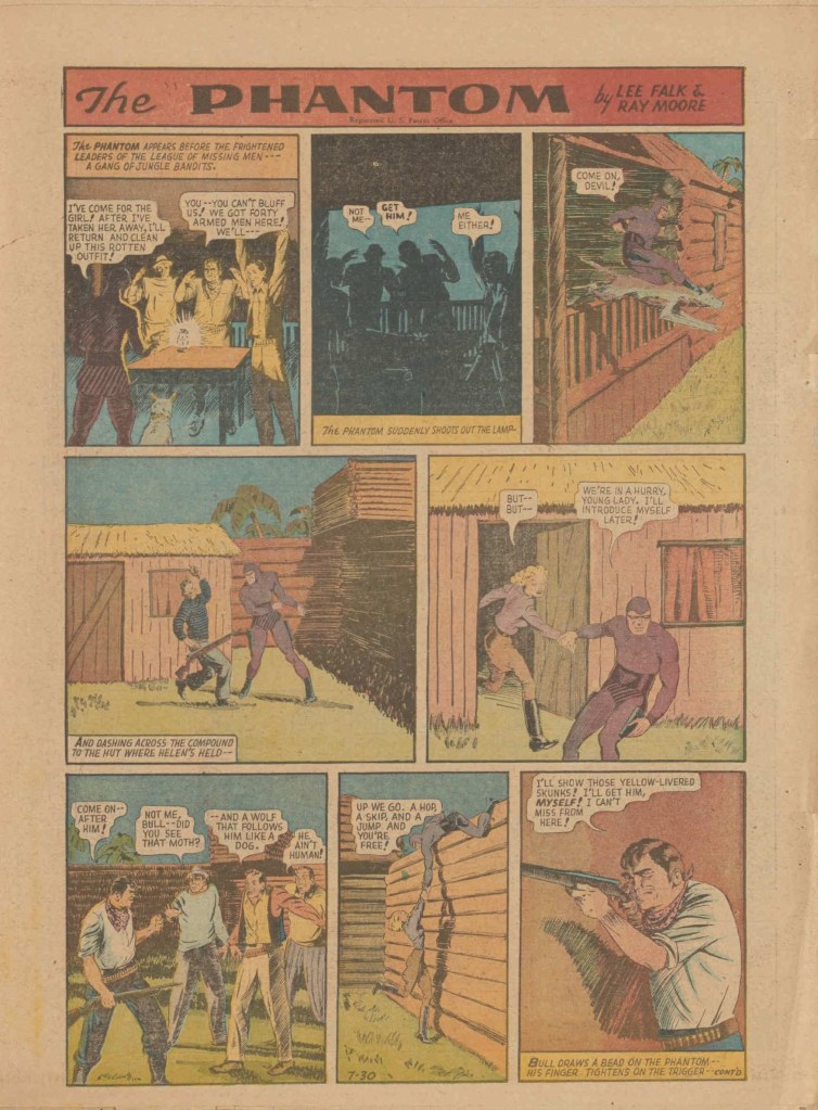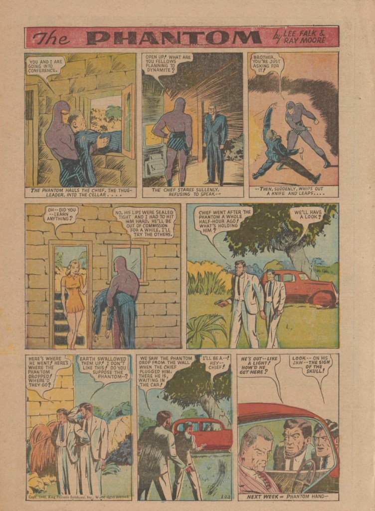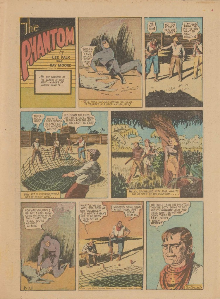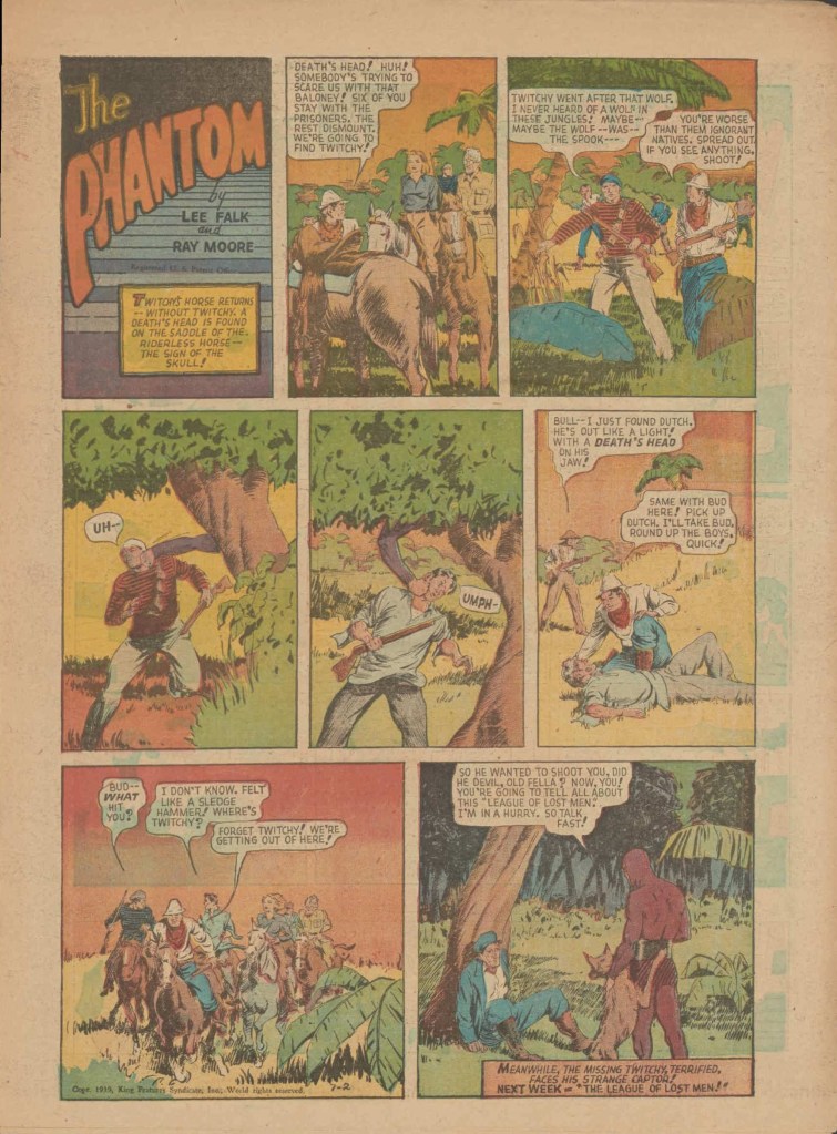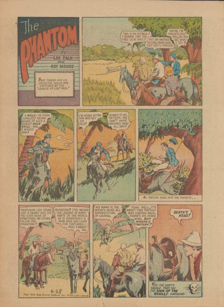 Below you can see an example of a daily Phantom comic strip. Most of the daily comic strip stories were individually titled and have Lee Falk (with the incorrect spelling) and Ray Moore noted.