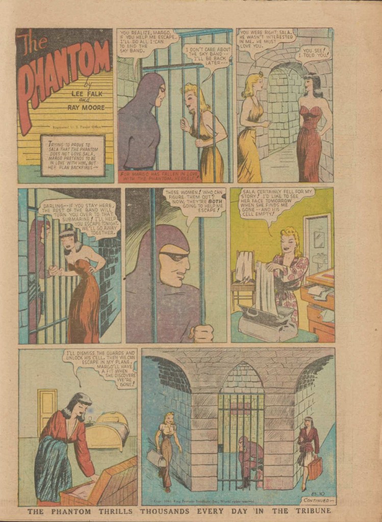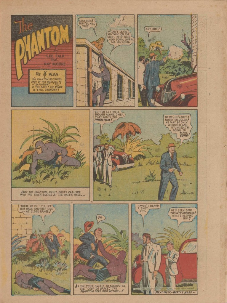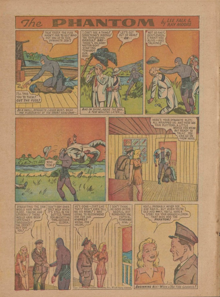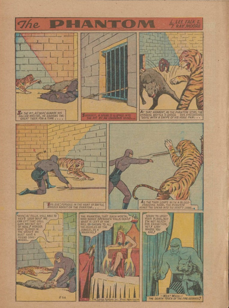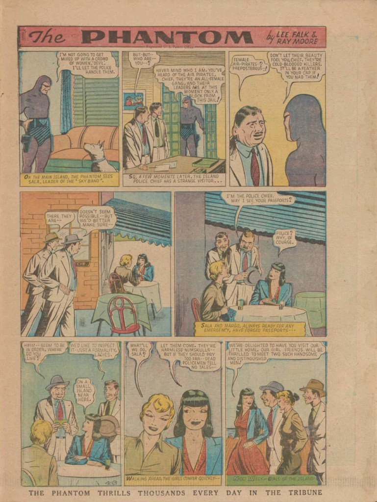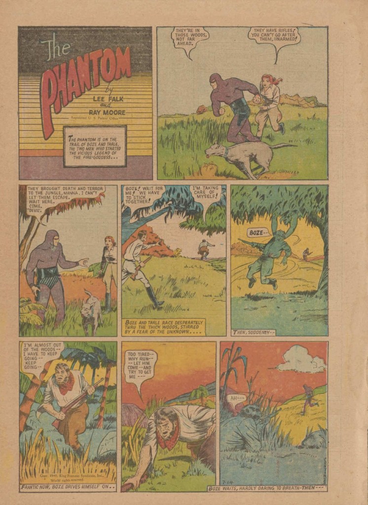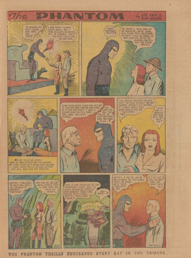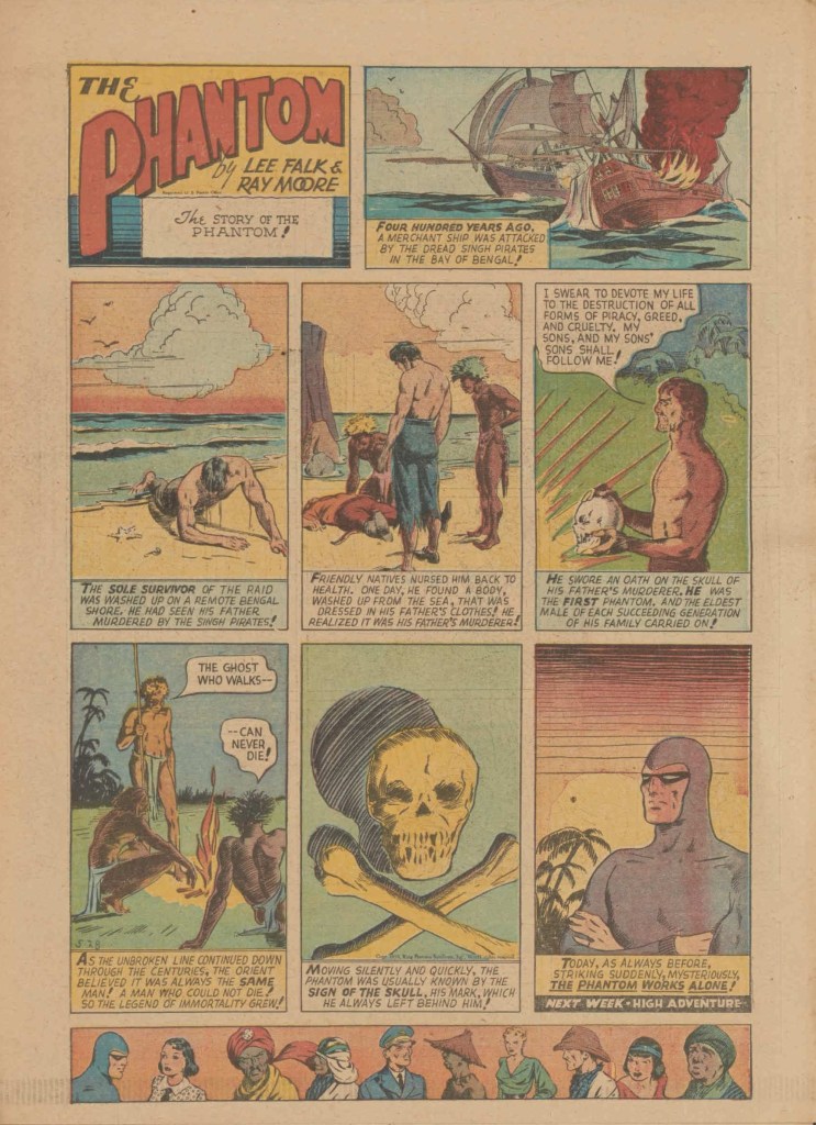Below you can see an example of a daily Phantom comic strip. Most of the daily comic strip stories were individually titled and have Lee Falk (with the incorrect spelling) and Ray Moore noted.