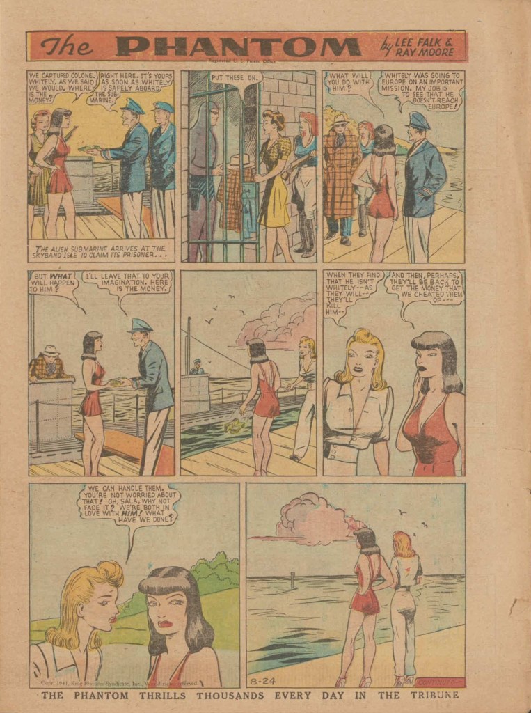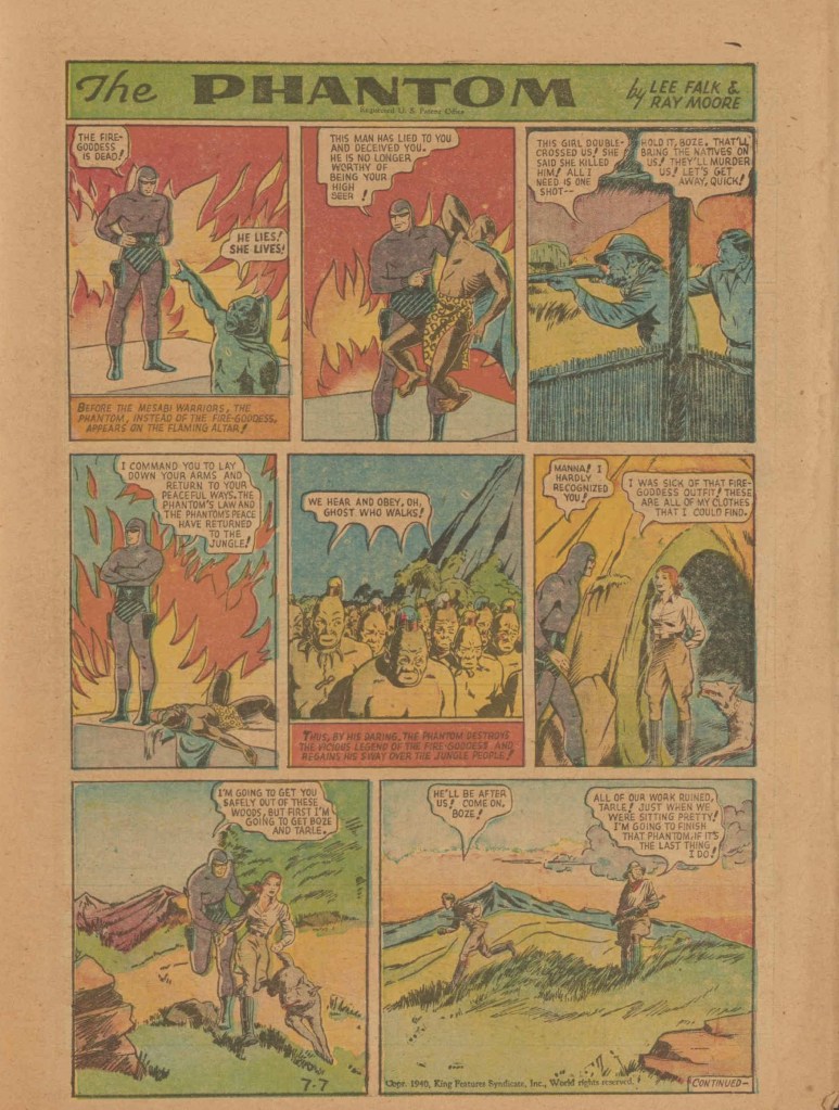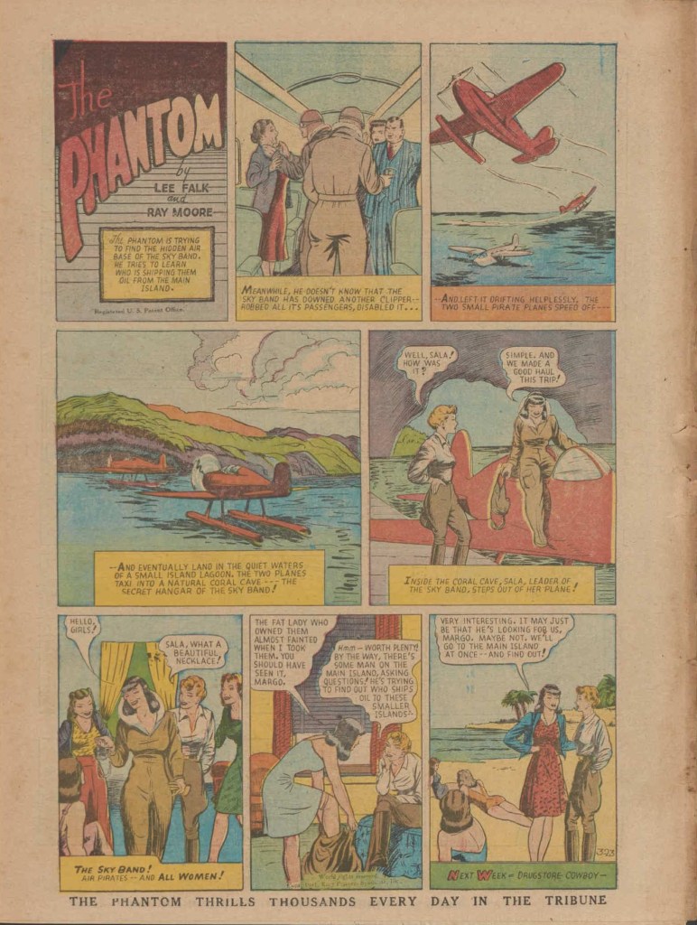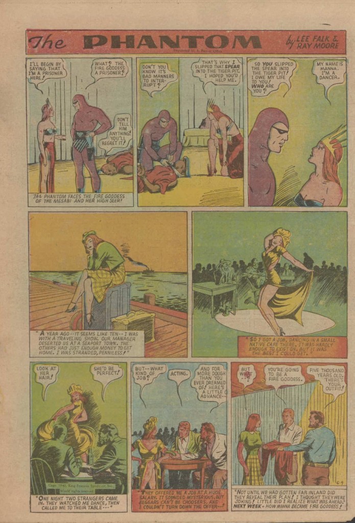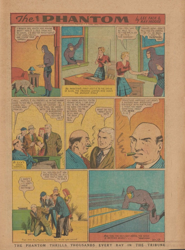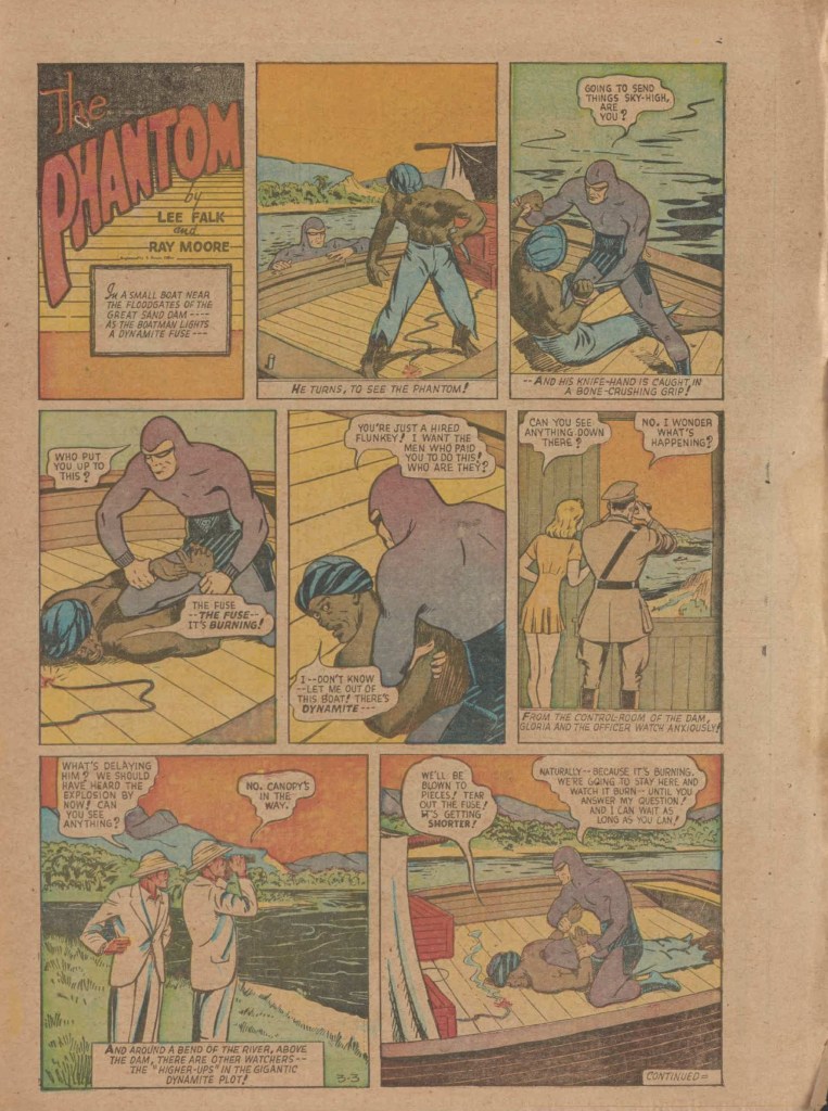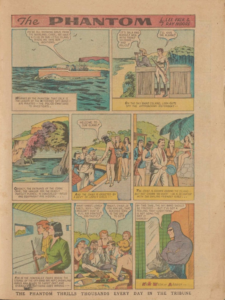 Below you can see an example of a daily Phantom comic strip. Most of the daily comic strip stories were individually titled and have Lee Falk (with the incorrect spelling) and Ray Moore noted.