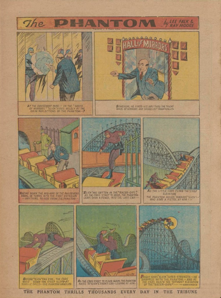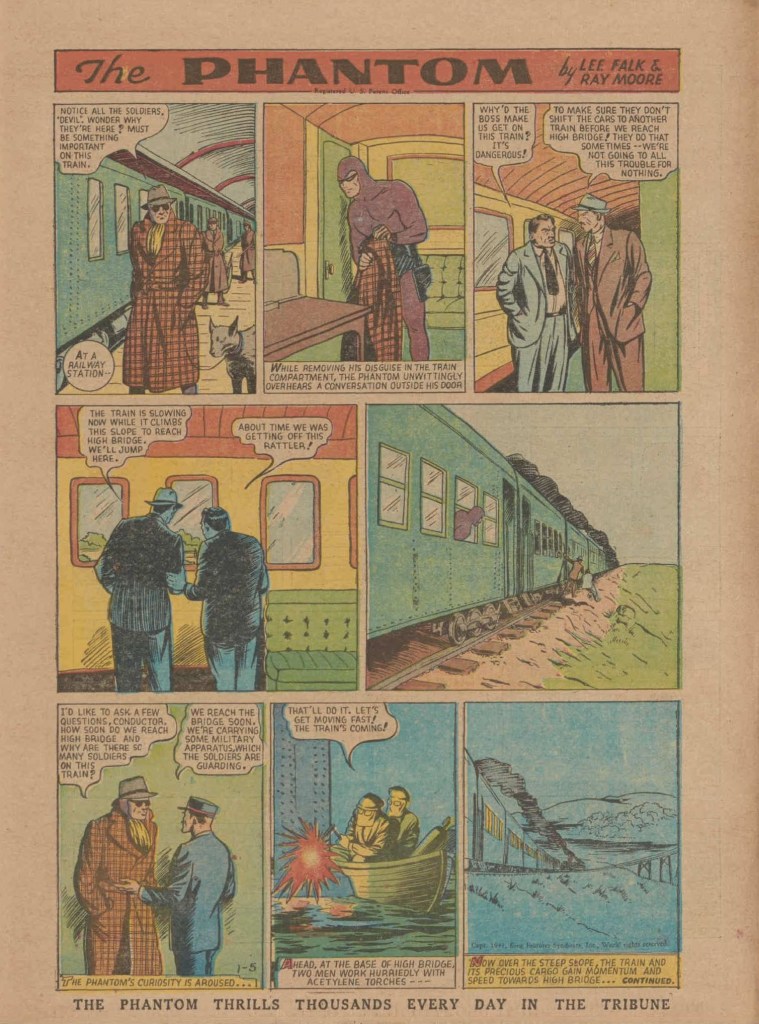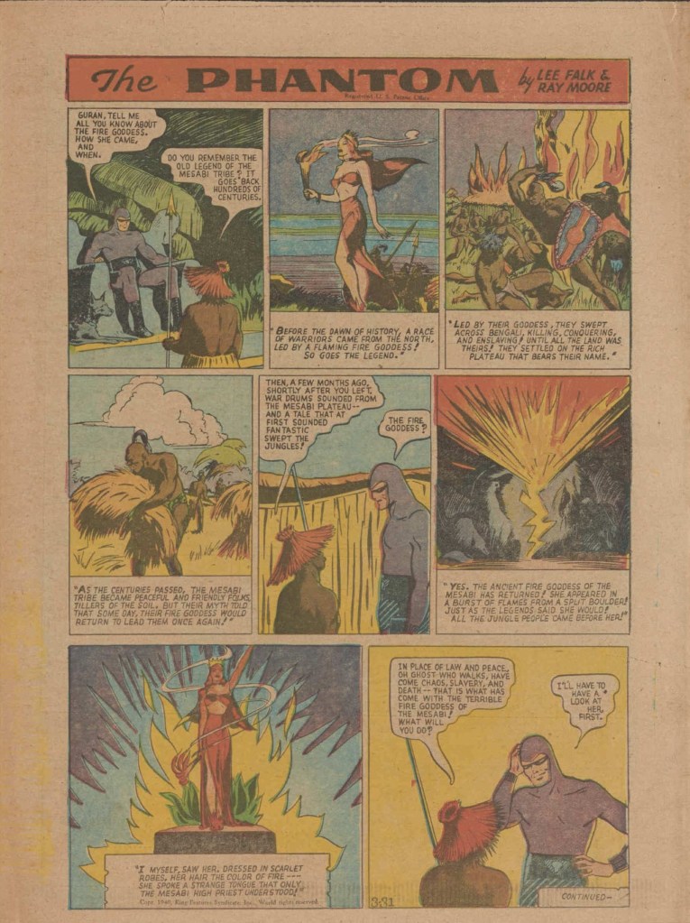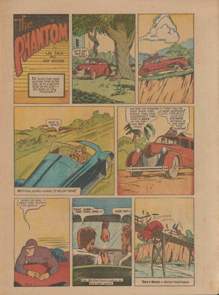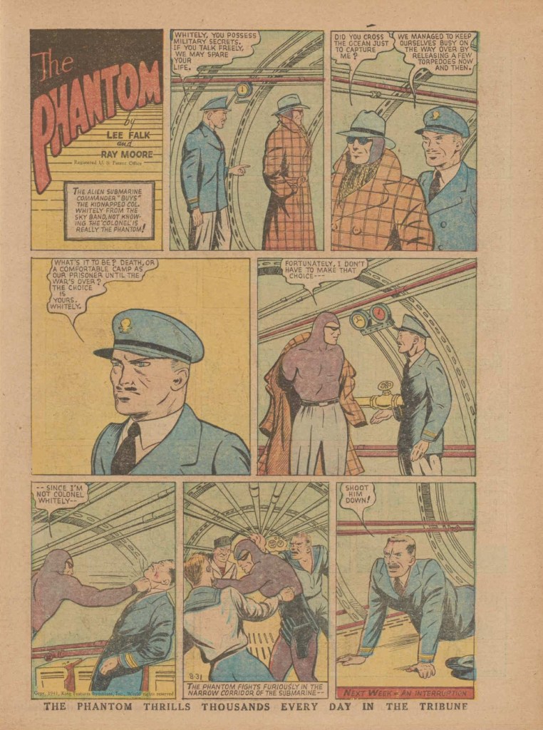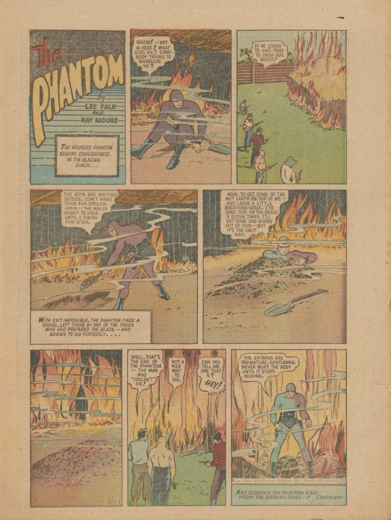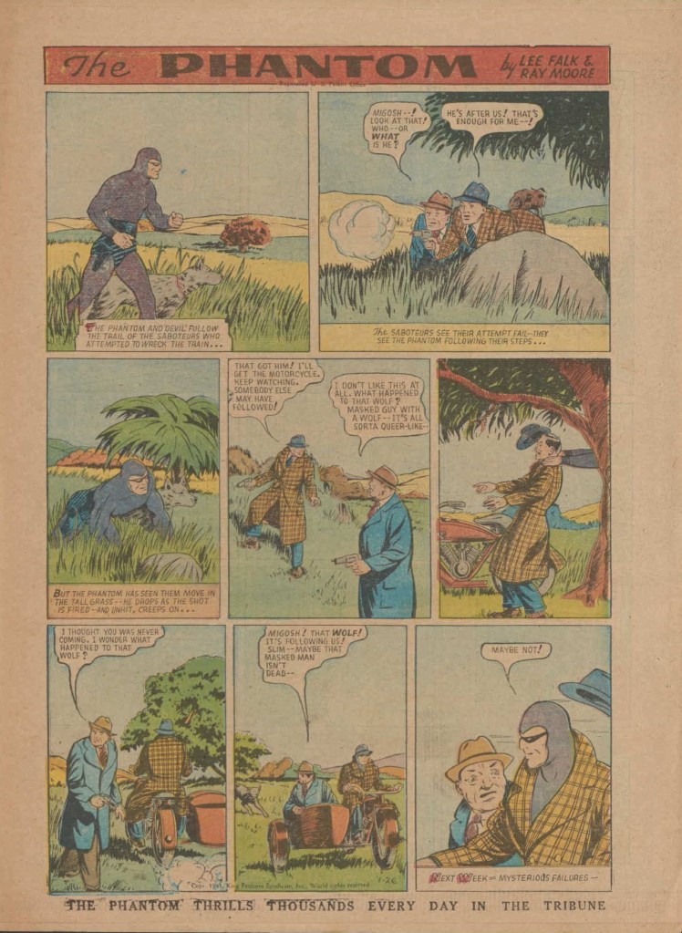 Below you can see an example of a daily Phantom comic strip. Most of the daily comic strip stories were individually titled and have Lee Falk (with the incorrect spelling) and Ray Moore noted.