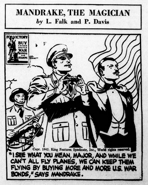 King Features Syndicate aided in the promotion of War Bonds and War Stamps. Published mainly through April and May in 1942, we find limited advertisements in various newspapers across the United States featuring both comic book characters created by Lee Falk, the Phantom and Mandrake the Magician. These advertisements directly sent a message to the reader to assist in the war efforts by purchasing War Bonds.