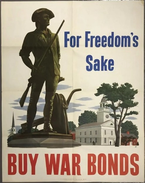 ‘The Minute Man’ is a Bronze sculpture created in 1874 by David Chester French and is located at the Minute Man National Historical Park, Concord, Massachusetts, USA. The sculpture became the symbol of the United States Defense War Bonds and War Stamps campaign, as seen on the cover of comic book edition number 1 by Family Comics (‘War Victory Comics’). We see the same image in the 2 advertisements above published by King Features Syndicate. Below we see a 1940’s ‘For Freedom’s Sake… Buy War Bonds’ poster featuring ‘The Minute Man’.
